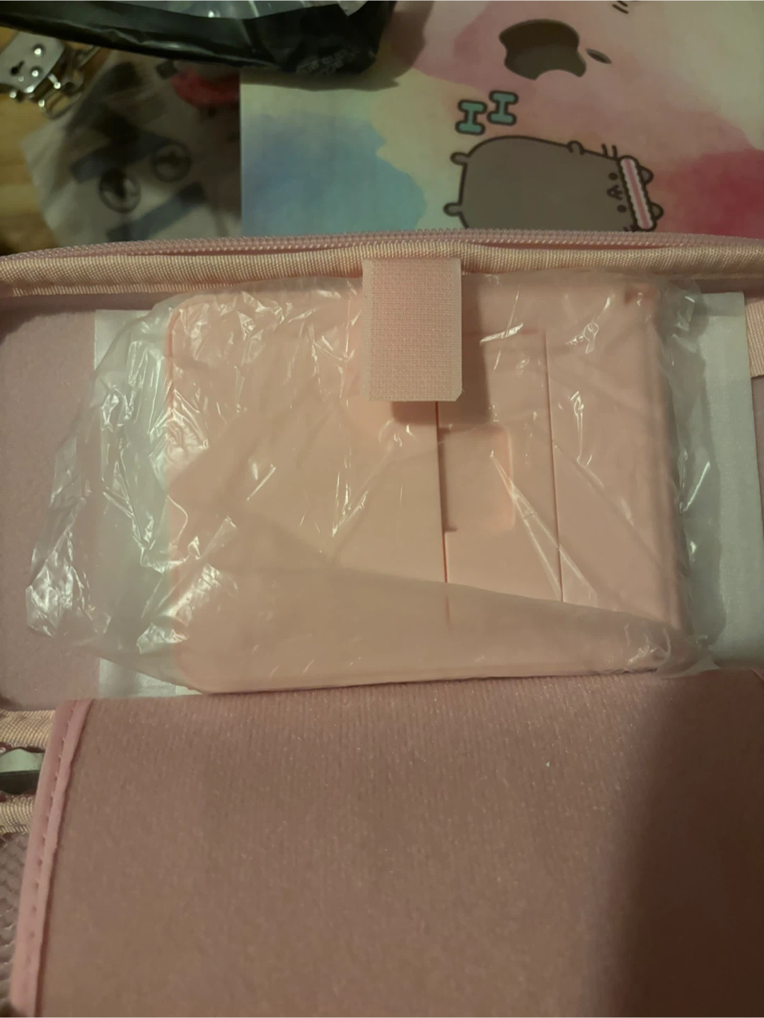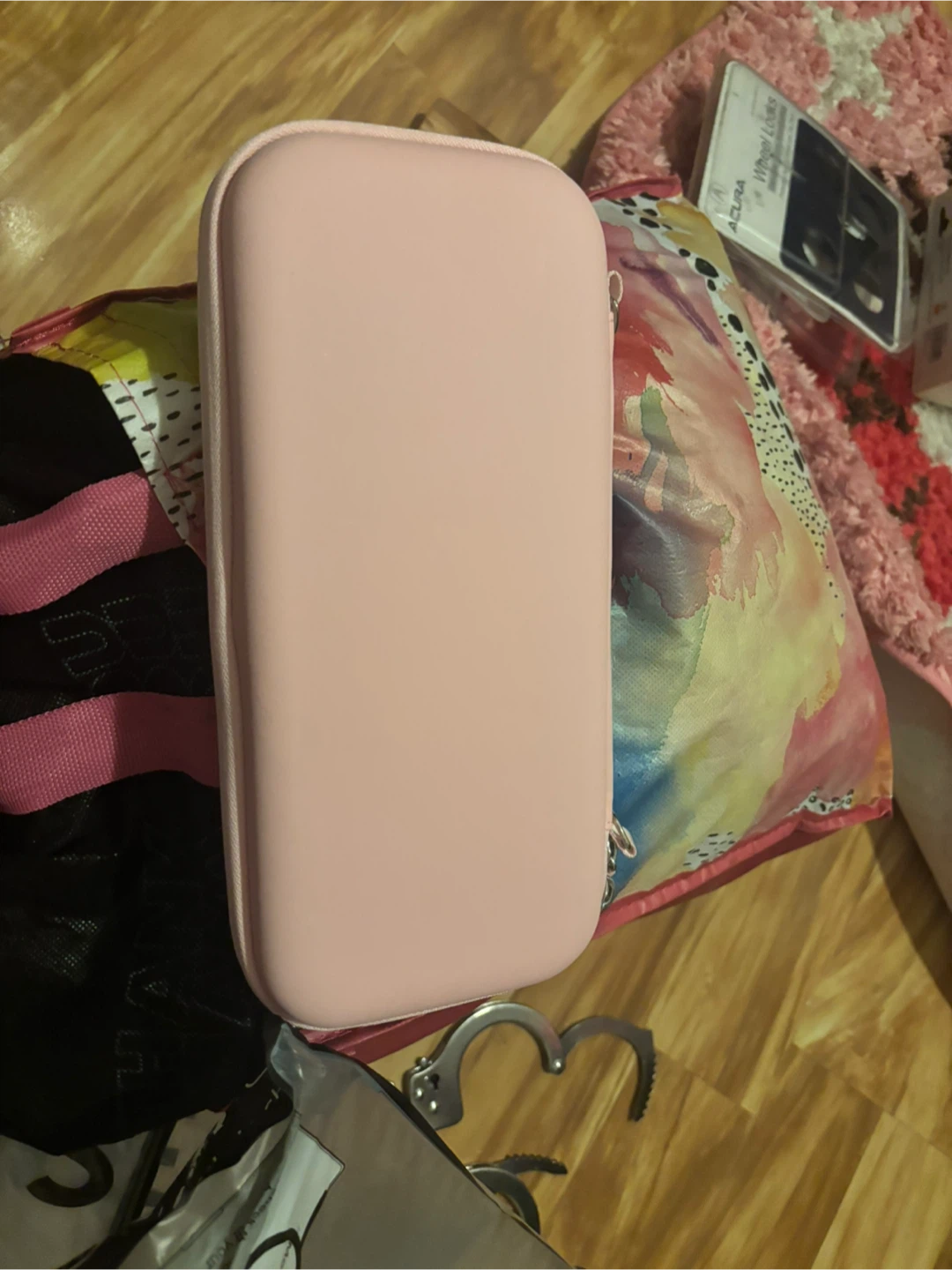 Selling a pink carrying case. It looks like it's in new condition and comes with a shoulder strap, thumb grips, and some cute stickers! Perfect for keeping your small items safe and organized for a Nintendo Switch