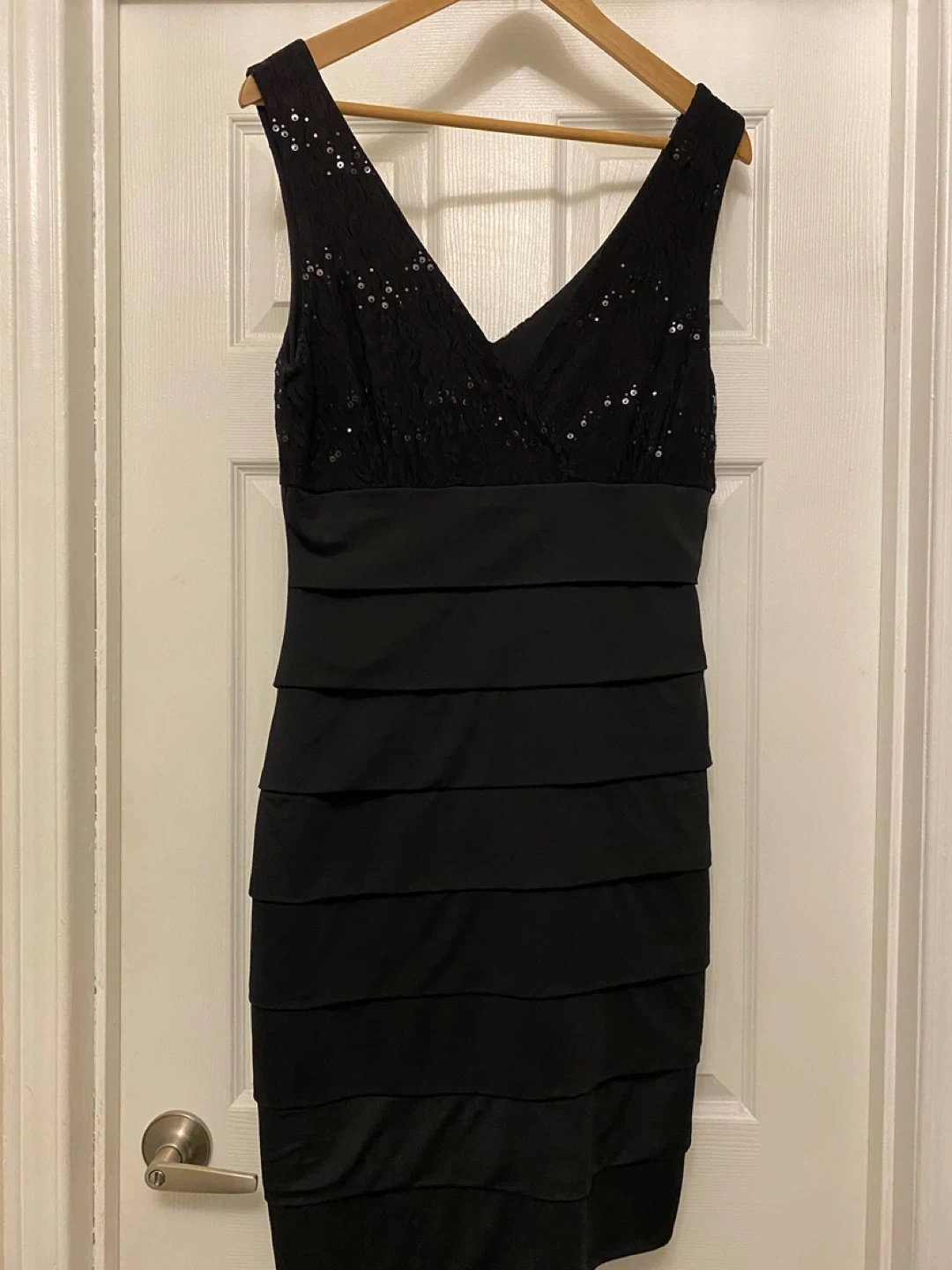 This is a never worn beautiful black dress! It features a lovely lace detail on the top with sequins and a tiered skirt. Great dress for upcoming holiday parties!