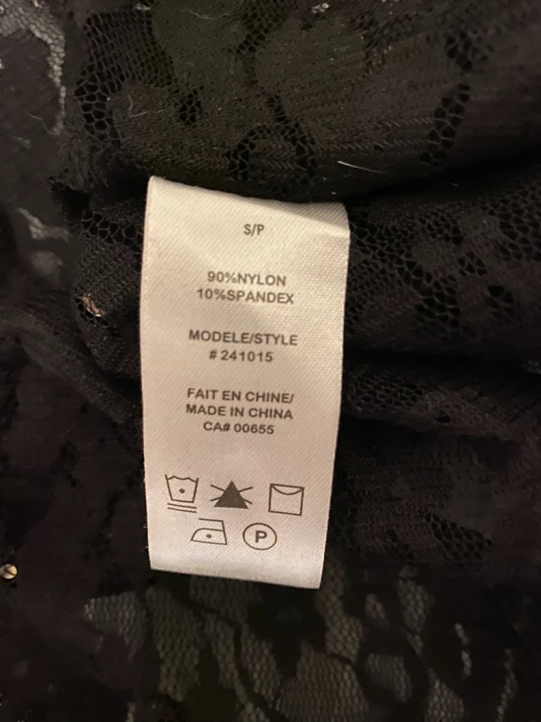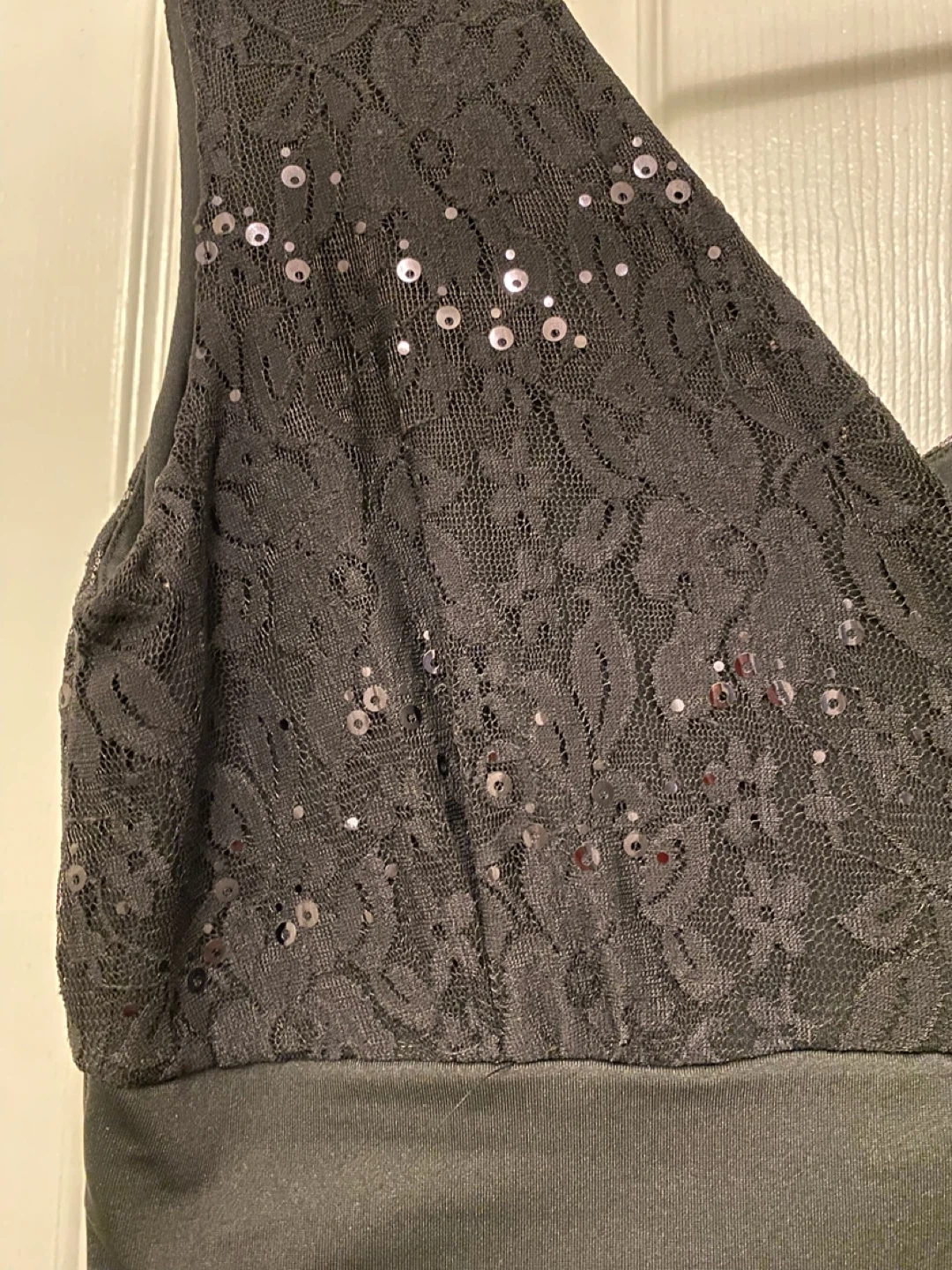 This is a never worn beautiful black dress! It features a lovely lace detail on the top with sequins and a tiered skirt. Great dress for upcoming holiday parties!