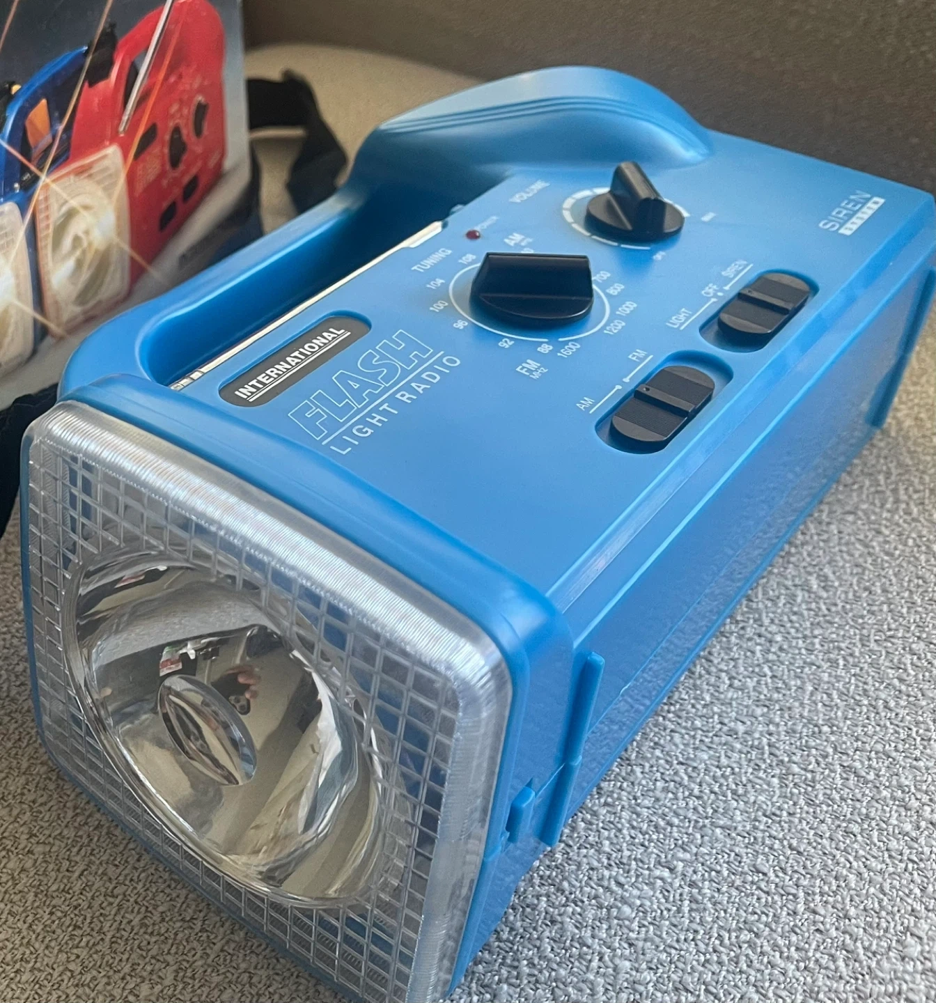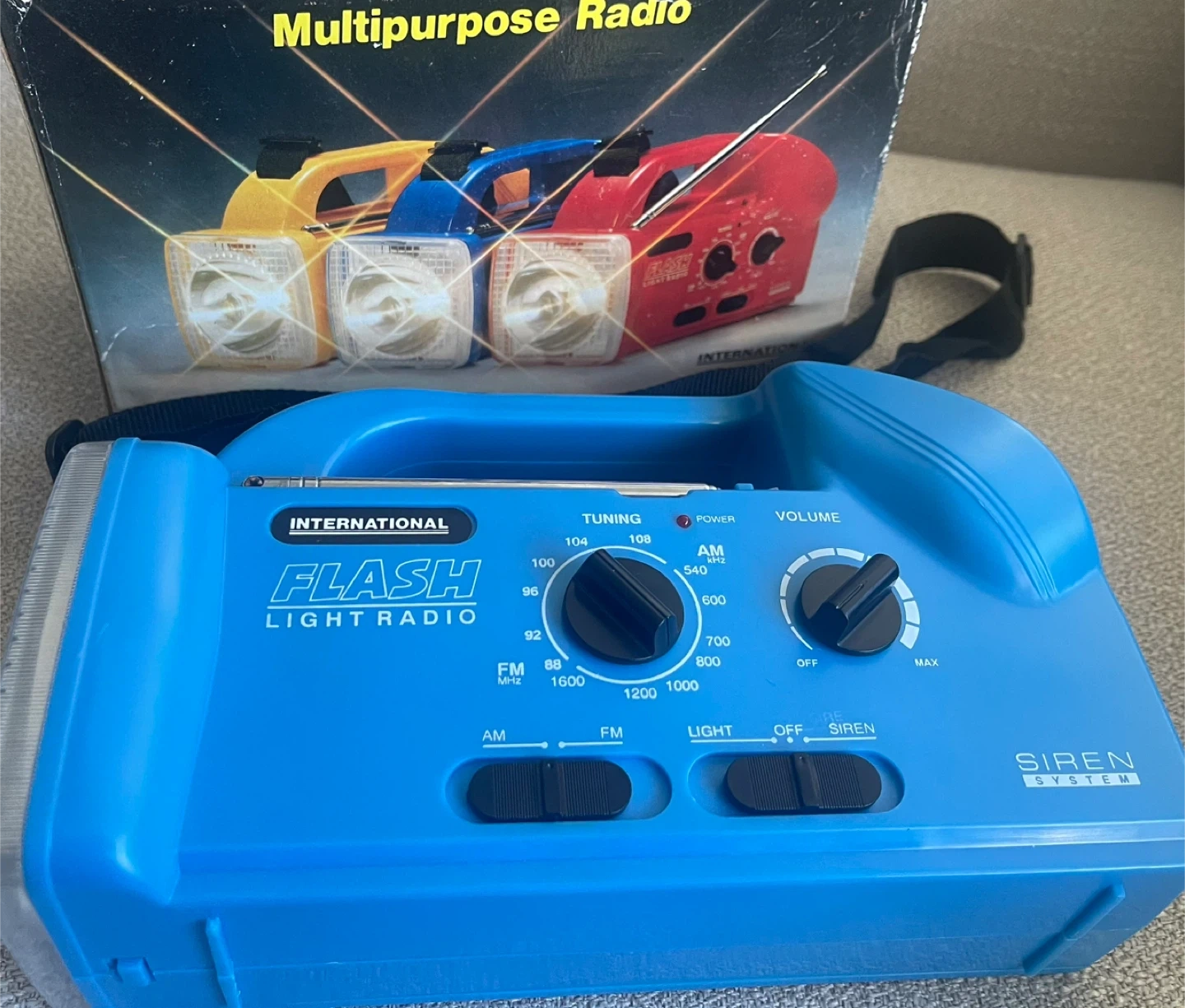 Multipurpose radio with AM/FM bands, flashlight, and siren functions. Includes original box. Great for emergency preparedness! With new 3 batteries.