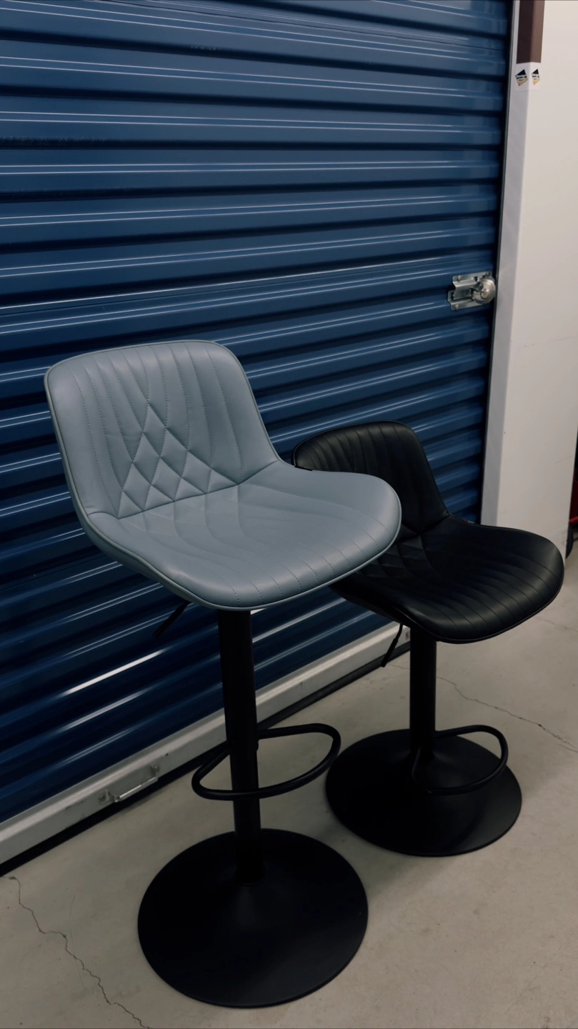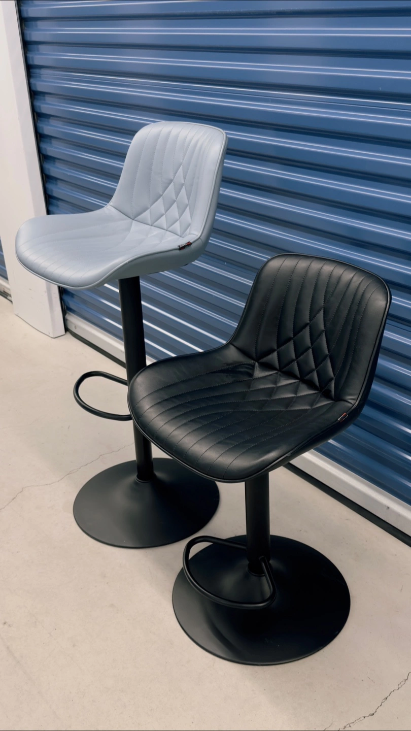 Set of two adjustable height bar stools, one in black and one in light blue. They're upholstered in faux leather with a diamond stitch pattern and feature a sturdy metal base with a footrest. Great for a kitchen counter or bar area!