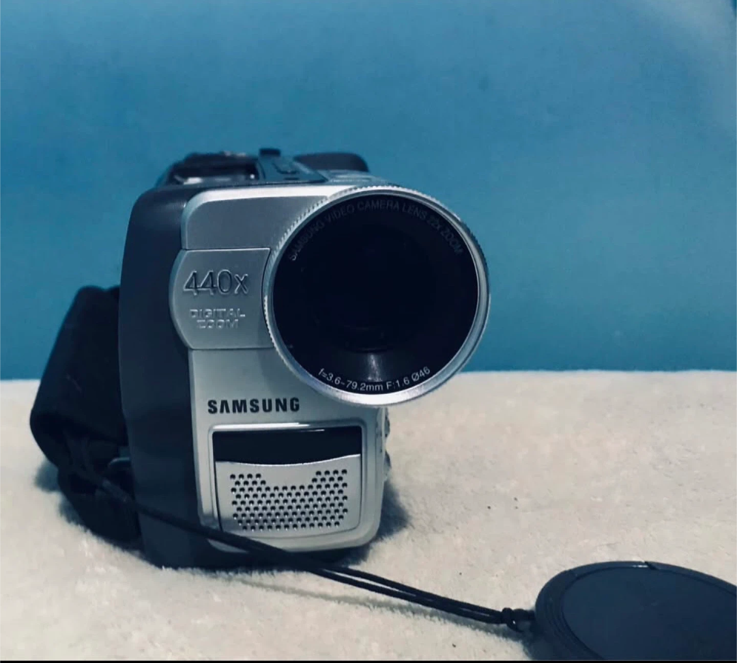 Samsung video camera with 440x digital zoom and 22x optical zoom lens. Features a focal length of 3.6-79.2mm and f/1.6 aperture. This camcorder is great for capturing detailed footage.