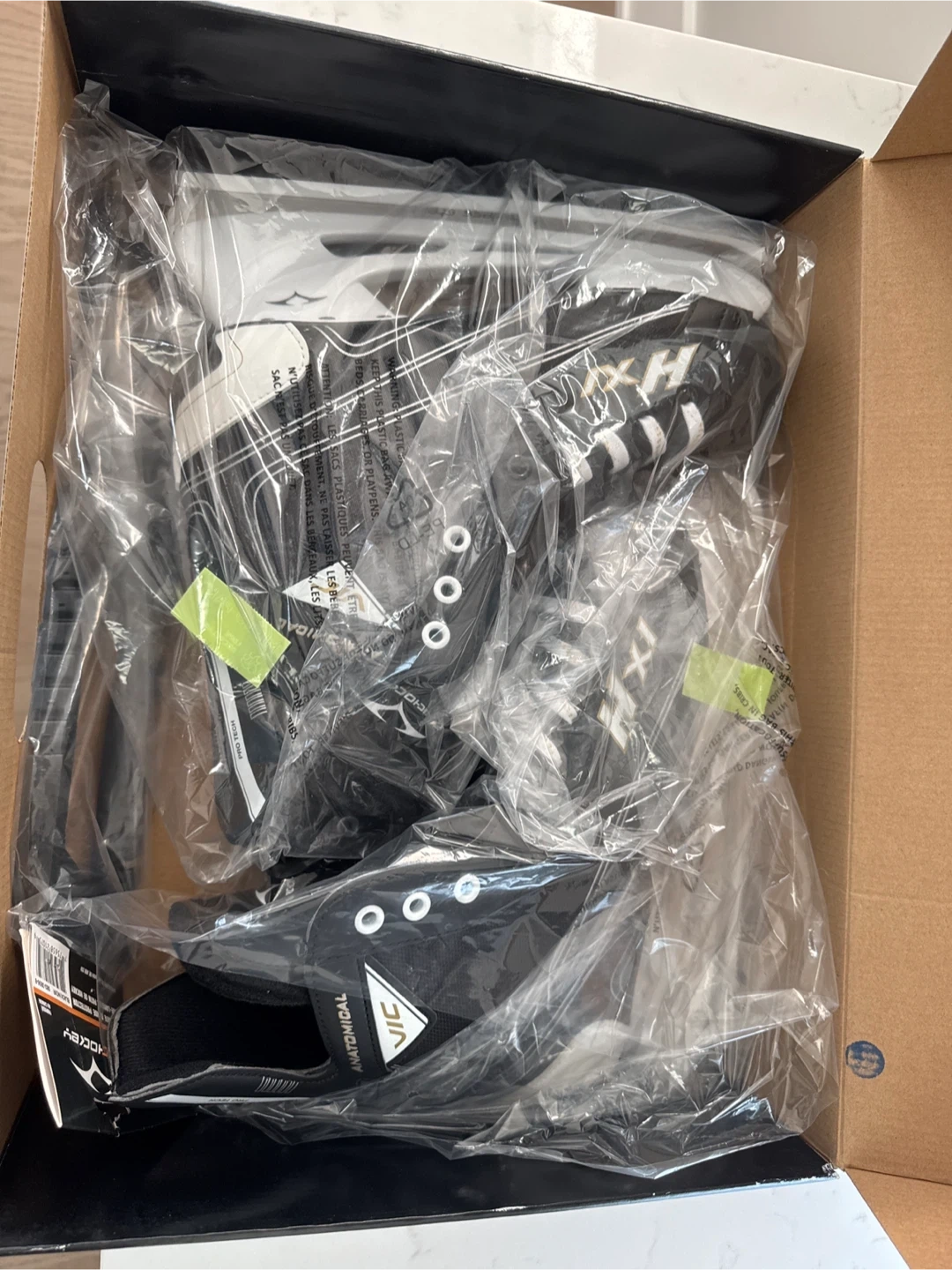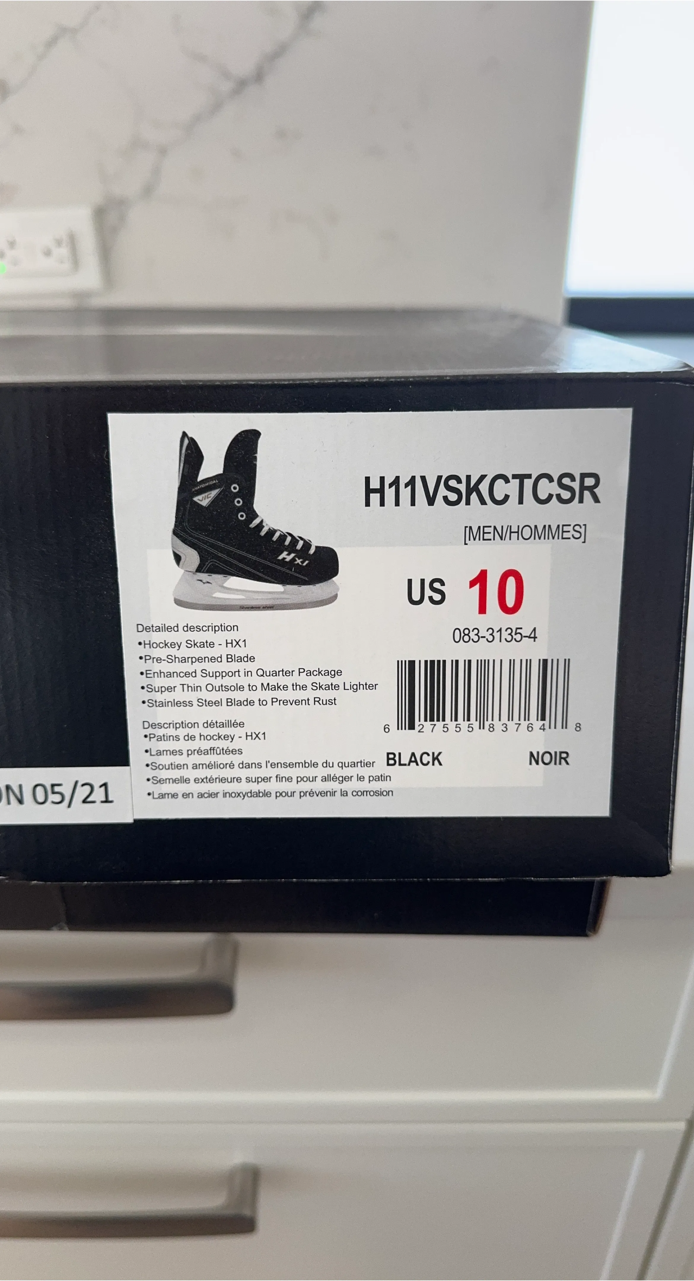 These are Vic brand hockey skates in a men's size 10. They feature a pre-sharpened blade and enhanced support in the quarter package. The skates have a slim design to reduce weight. They're also equipped with a stainless steel blade to prevent rust.