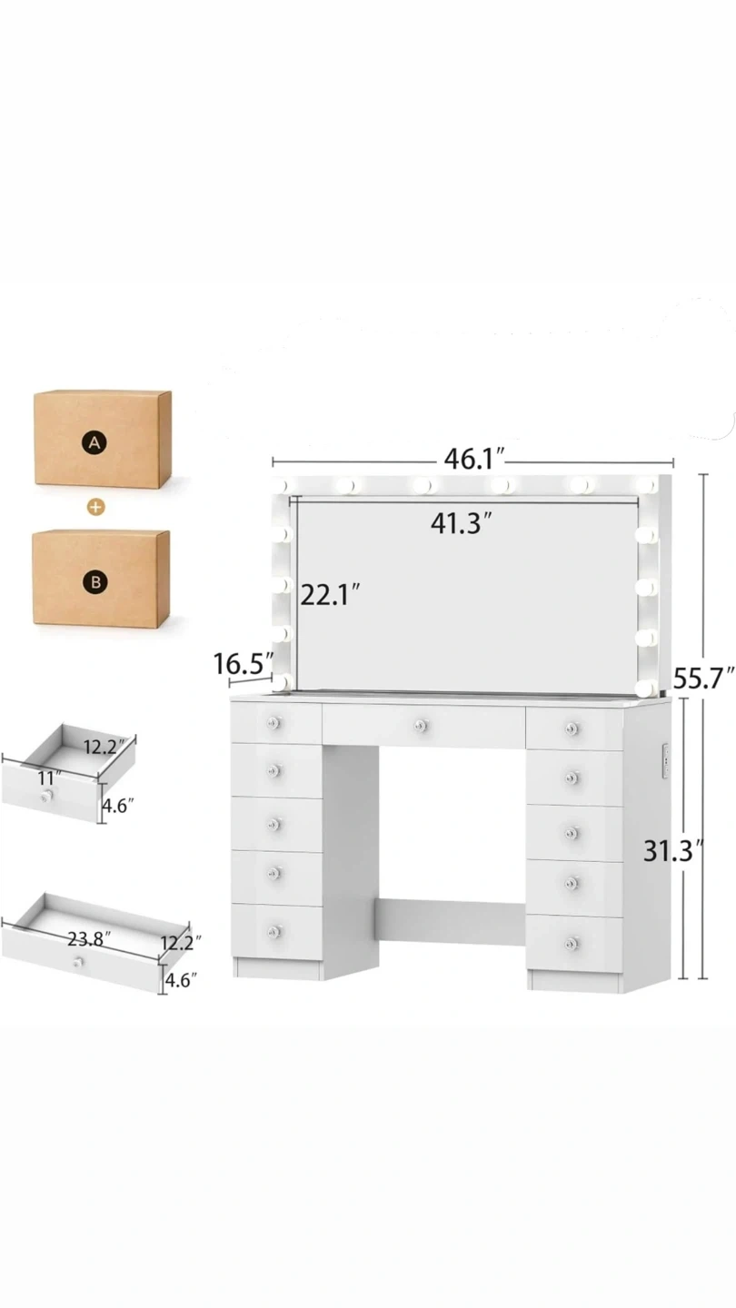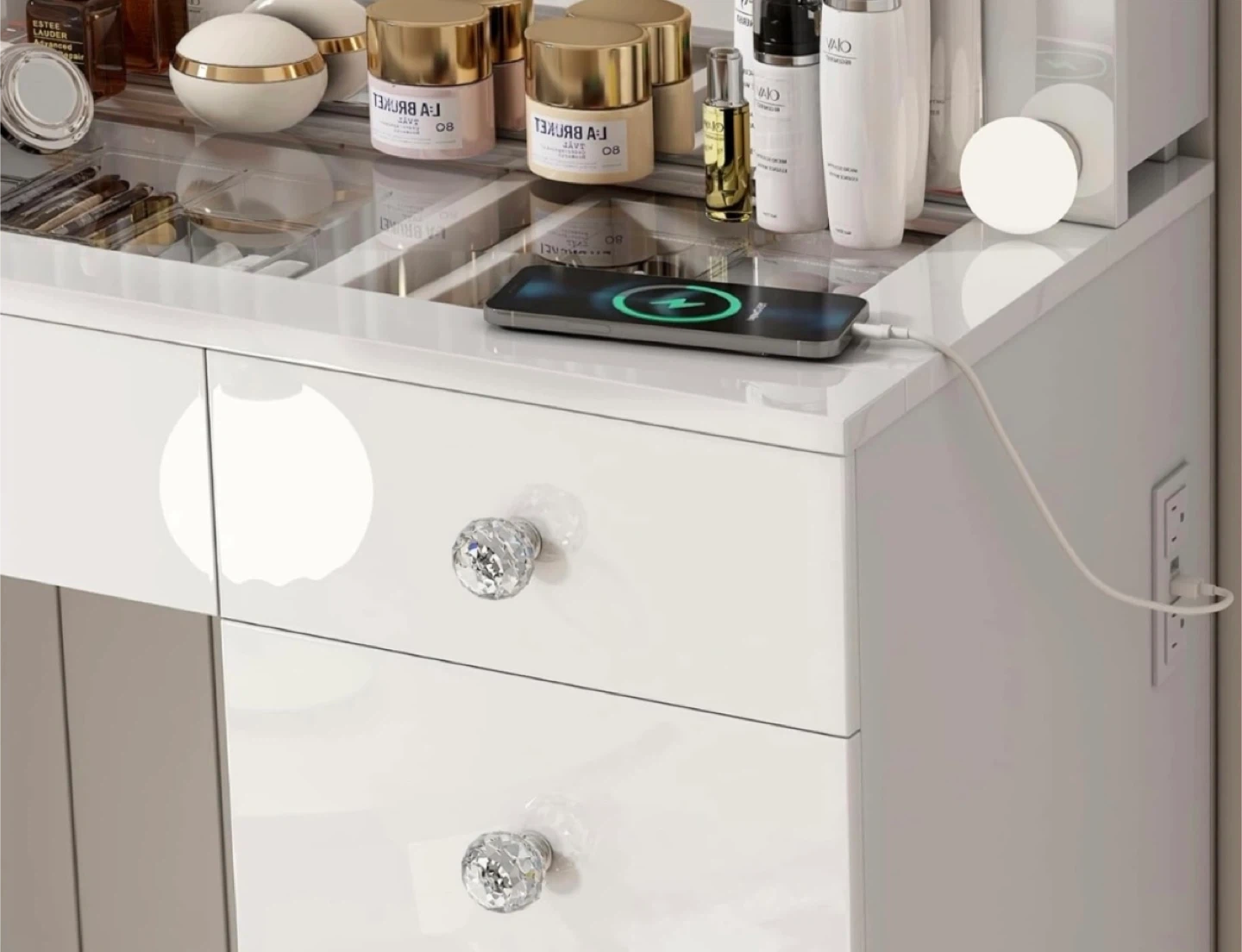 Modern white vanity desk with a large lighted mirror and plenty of storage. Perfect for makeup, skincare, and getting ready.