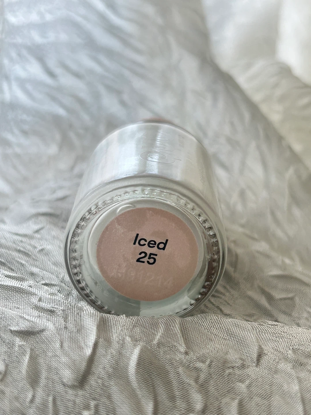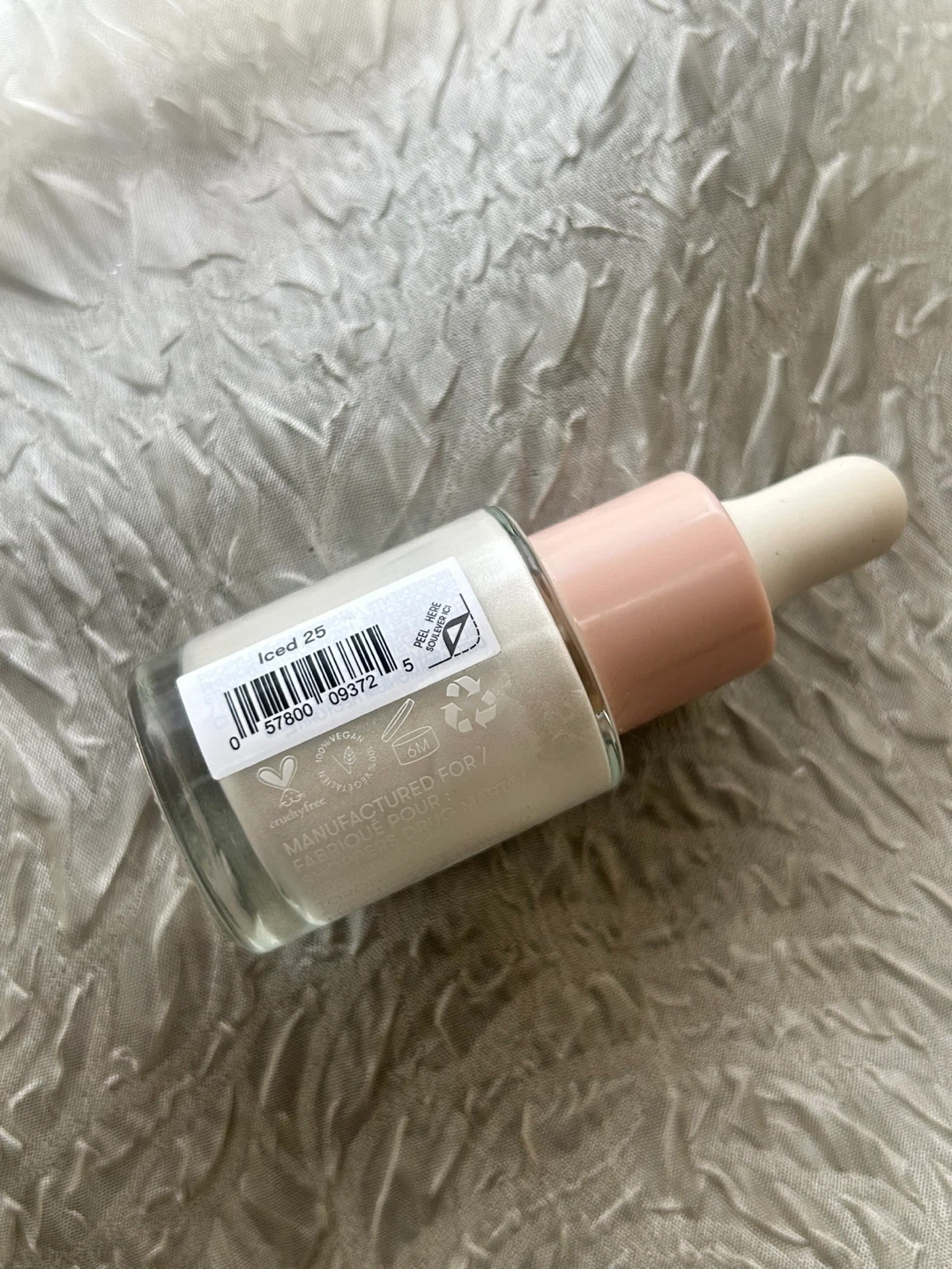 This is a QUO Beauty liquid illuminating drops in the shade Iced 25. It comes in a glass bottle with a dropper applicator and a pink cap. This highlighter gives a luminous finish.