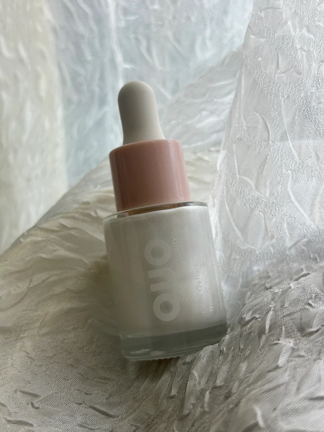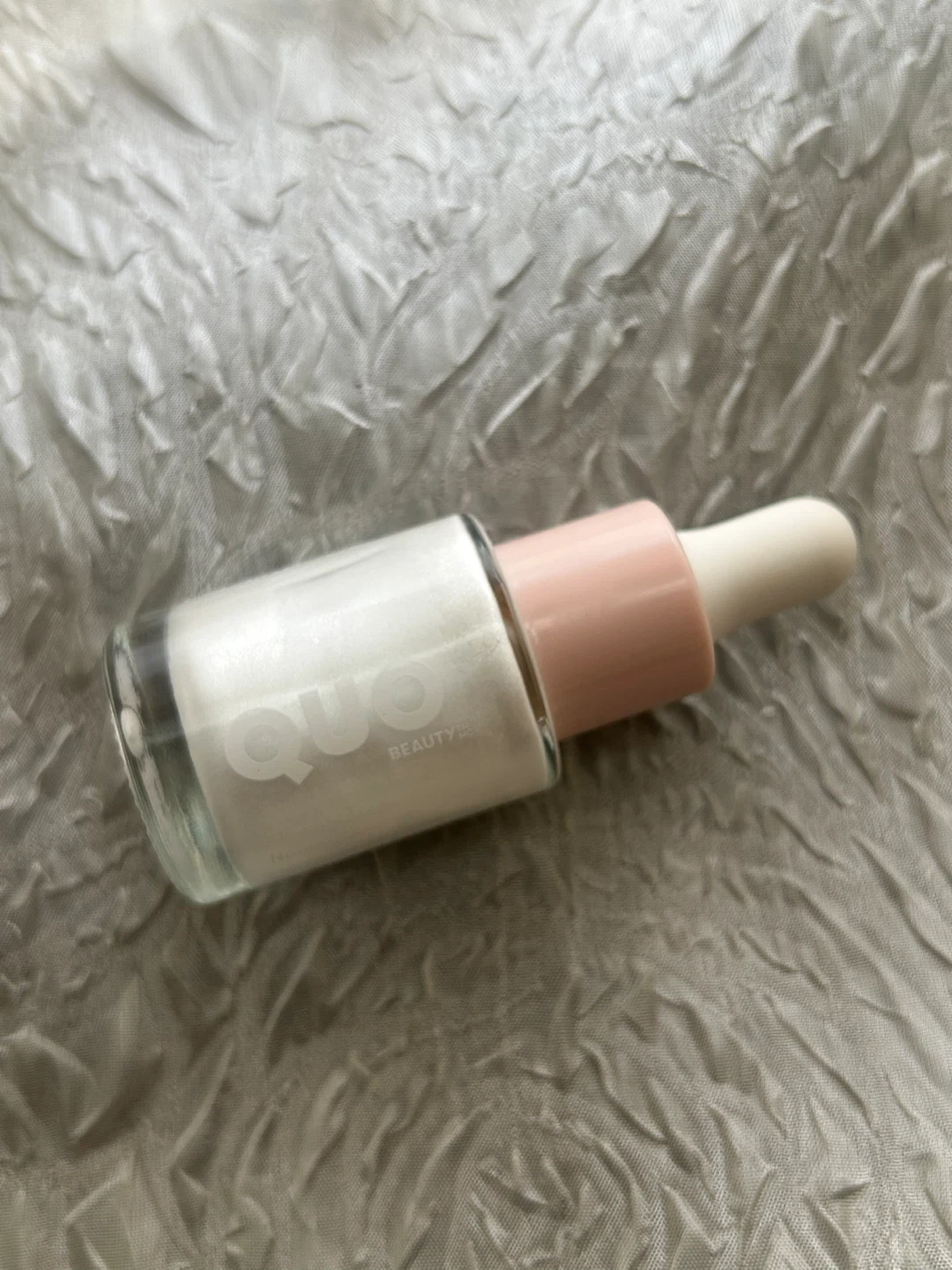 This is a QUO Beauty liquid illuminating drops in the shade Iced 25. It comes in a glass bottle with a dropper applicator and a pink cap. This highlighter gives a luminous finish.