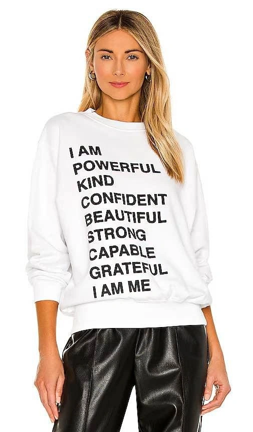 Authentic Anine Bing Empowerment Ramona Sweatshirt in white. Features the iconic affirmation text: “I AM POWERFUL KIND CONFIDENT BEAUTIFUL STRONG CAPABLE GRATEFUL I AM ME”. Brand: Anine Bing. Size: Medium. Color: White. Condition: Gently used, great condition. Original price: ~$169 USD. Status: Sold out everywhere. Super comfy, elevated casual staple — perfect with leather pants, denim, or layered under a coat. Smoke-free home. Pick up in Abbotsford, Mount Lehman Area.