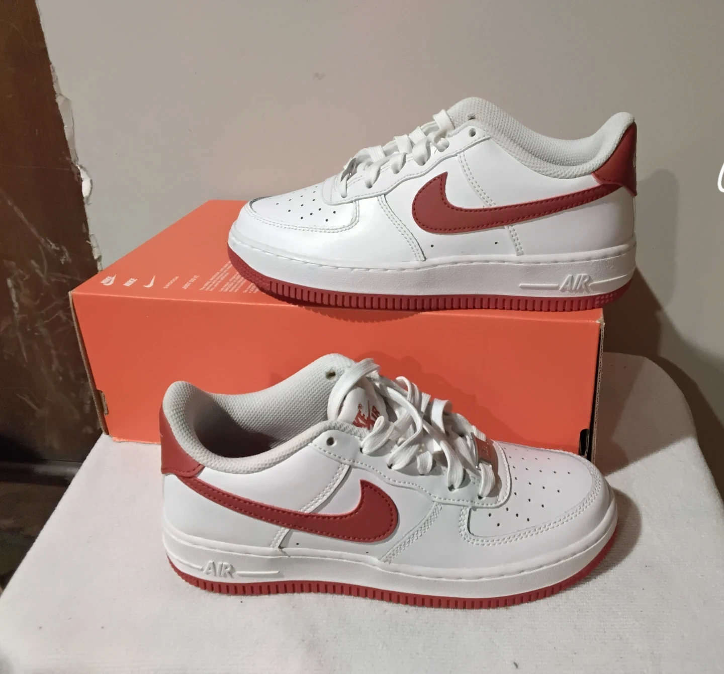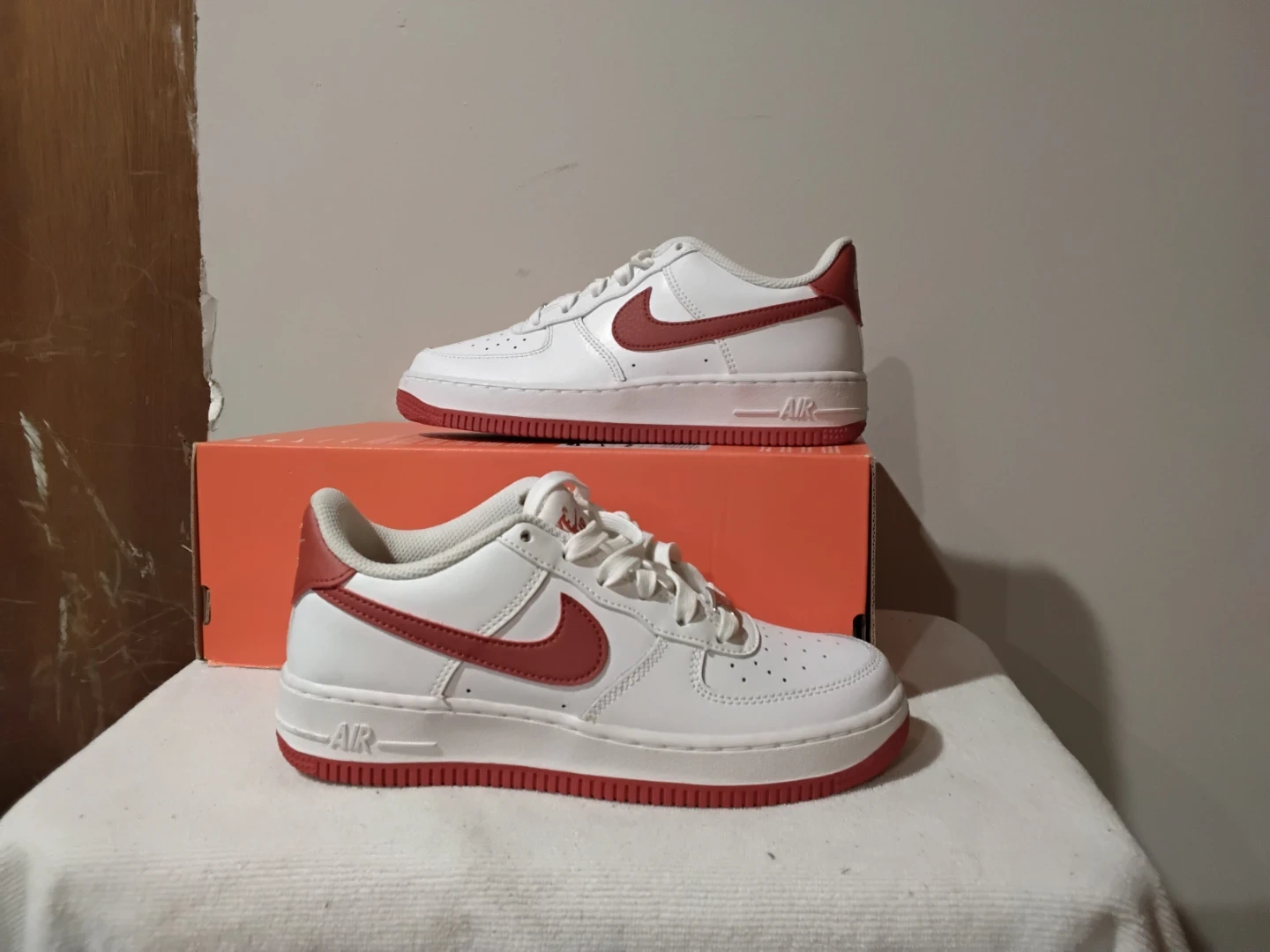 Classic white Nike Air Force 1s with red accents. Leather upper and rubber sole. Includes original box. Youth size 7Y.