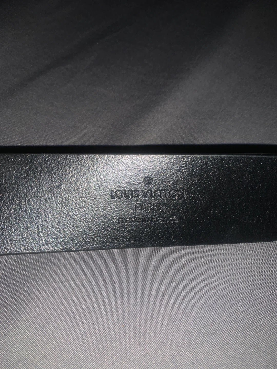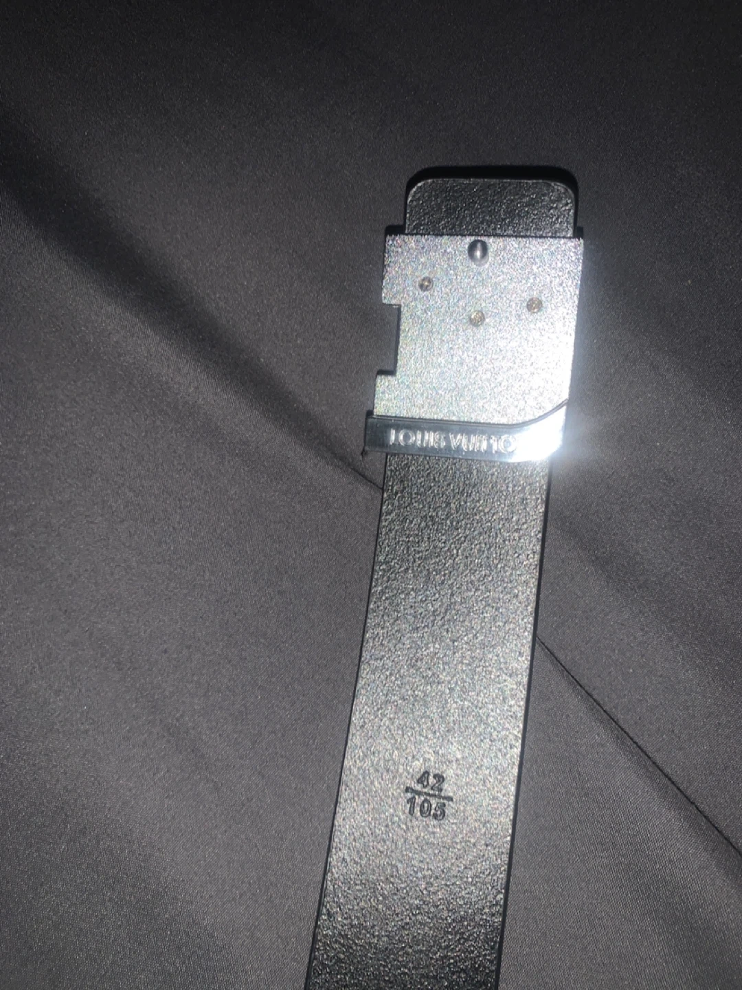 This is a Louis Vuitton belt. It's black with a silver buckle. The belt strap is made of leather and has 'LOUIS VUITTON PARIS' stamped on it. Size 105.