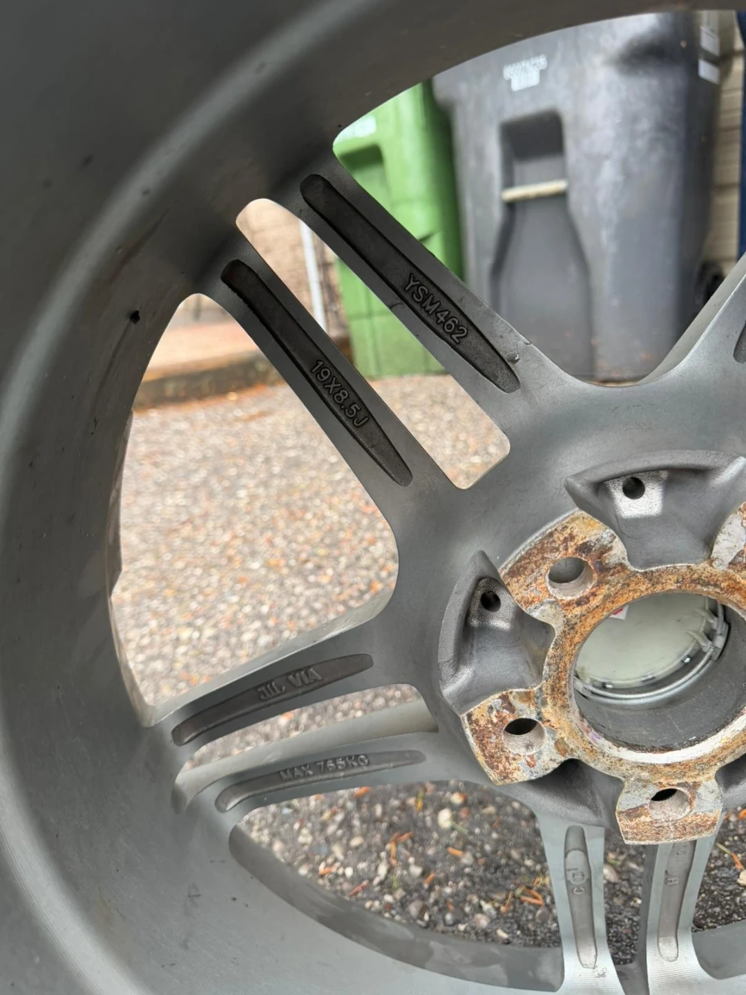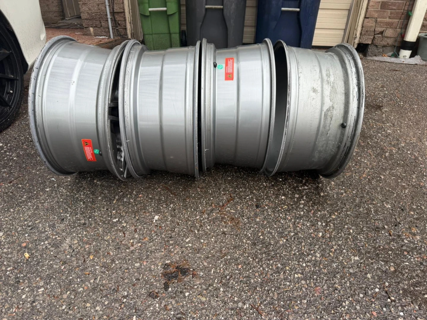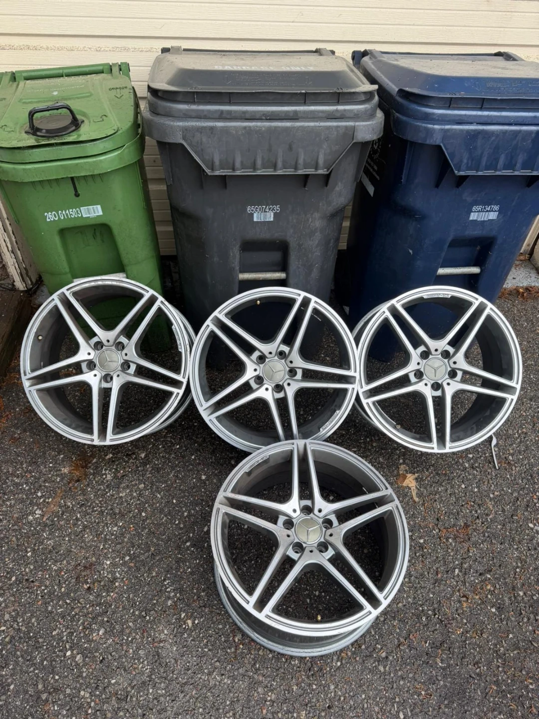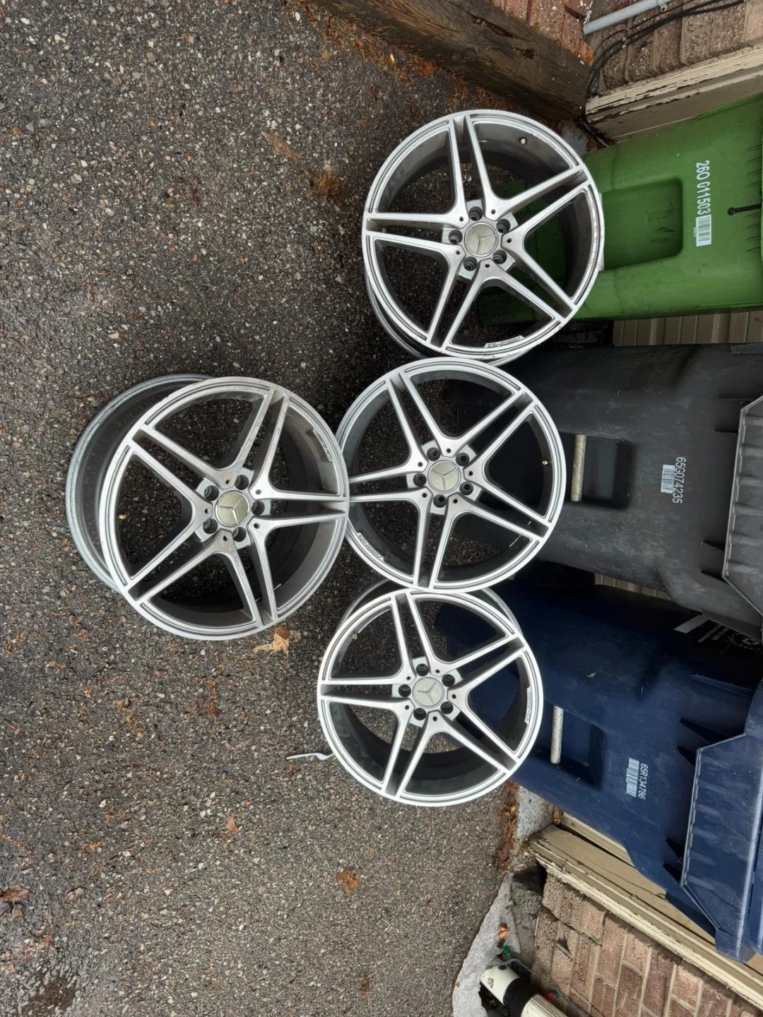 Set of four genuine Mercedes-Benz AMG alloy wheels. These wheels are silver and come in a 5-spoke design. They're in used condition, showing some wear. Perfect for a Mercedes-Benz enthusiast looking to upgrade their vehicle's look!