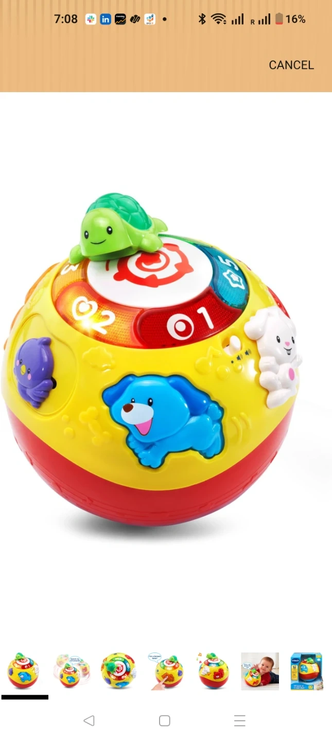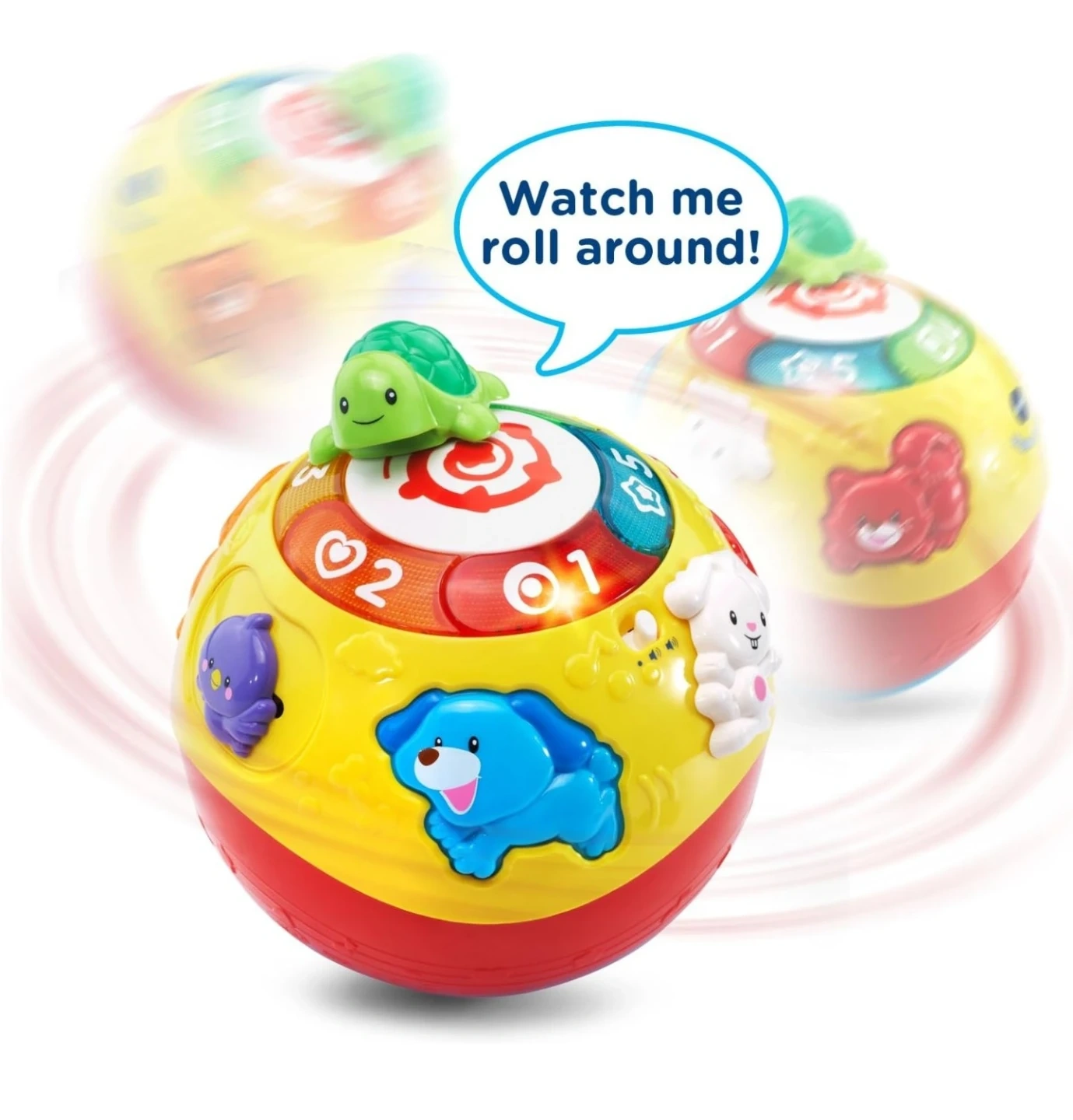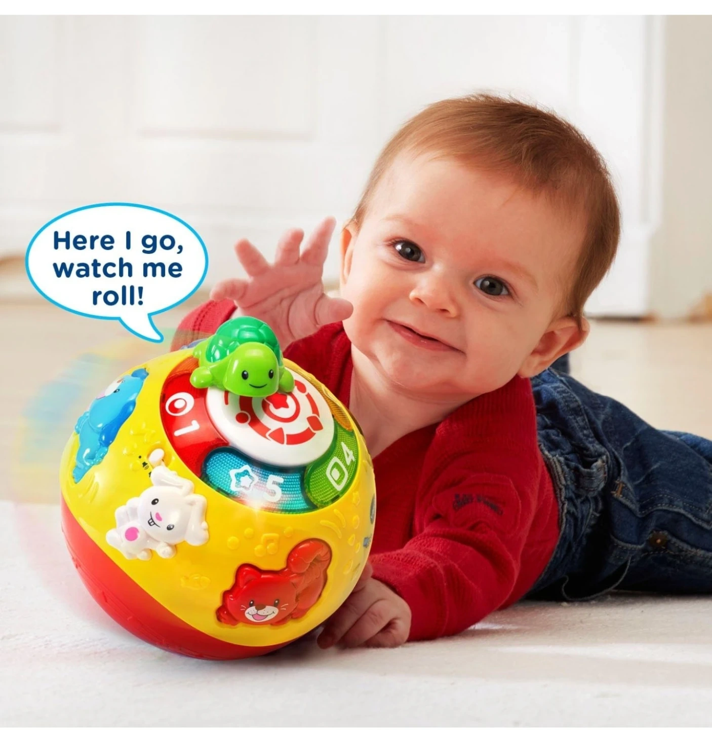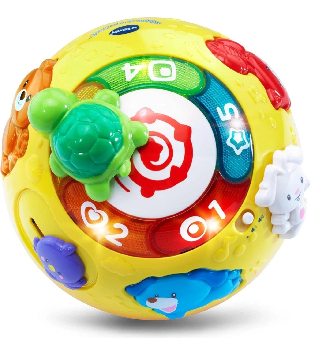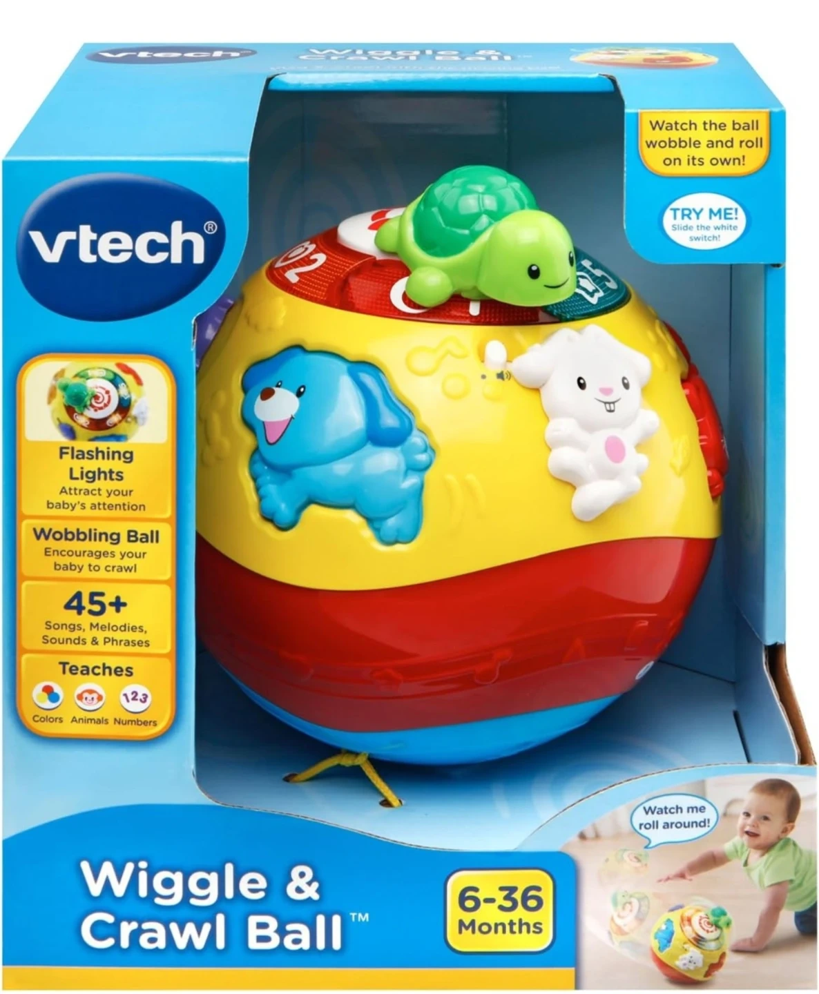 This VTech Wiggle & Crawl Ball is designed for ages 6-36 months. It features flashing lights, plays over 45 songs, melodies, sounds, and phrases to attract baby's attention. The ball encourages babies to crawl as it wobbles and rolls on its own.