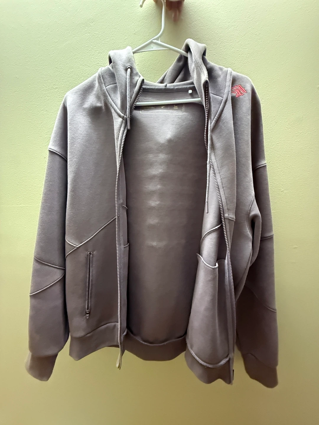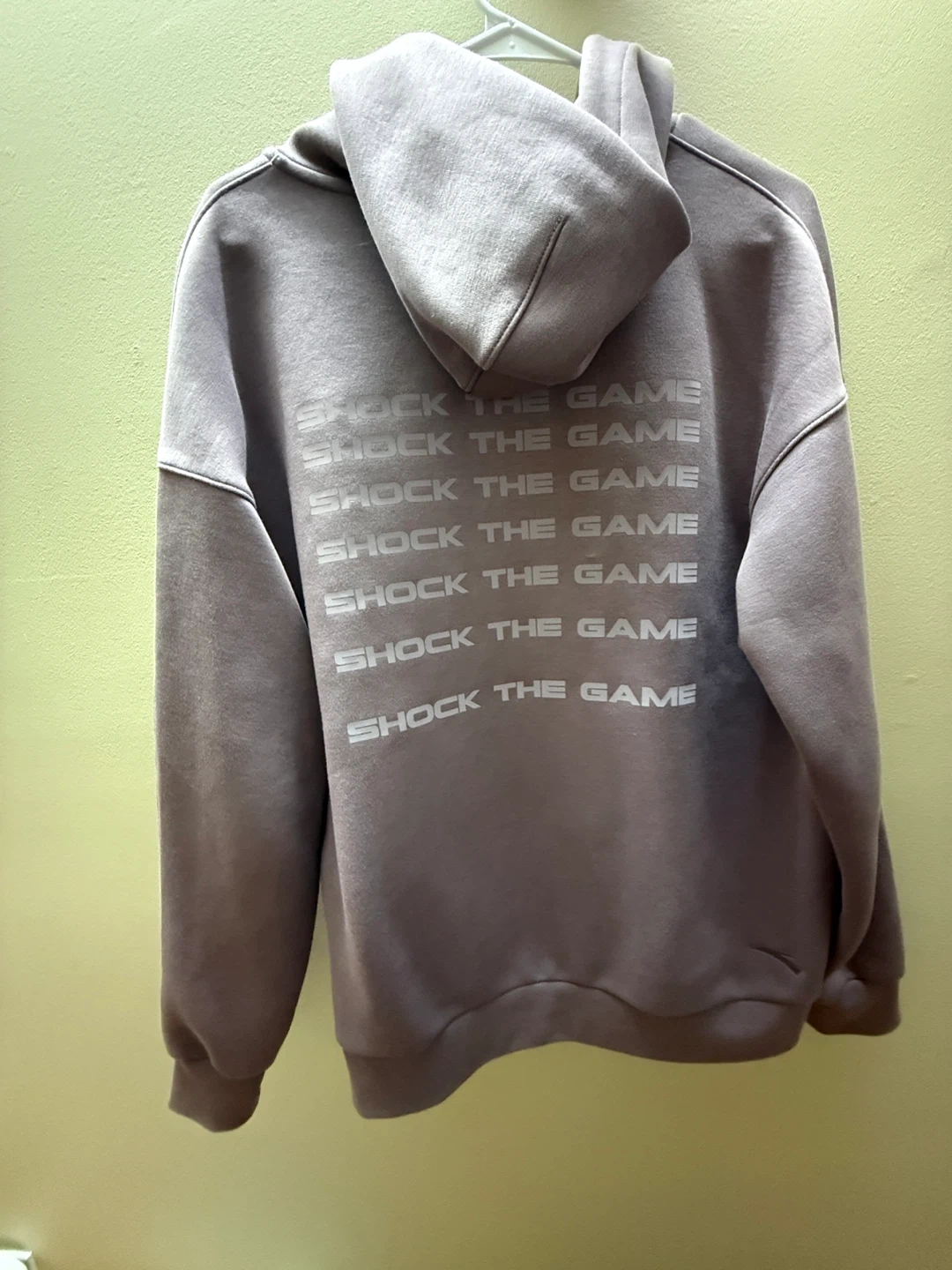 Purple zip-up hoodie with "SHOCK THE GAME" text graphic on the back. It's a size medium with a full zip closure and front pockets. Made of soft, comfortable fabric.