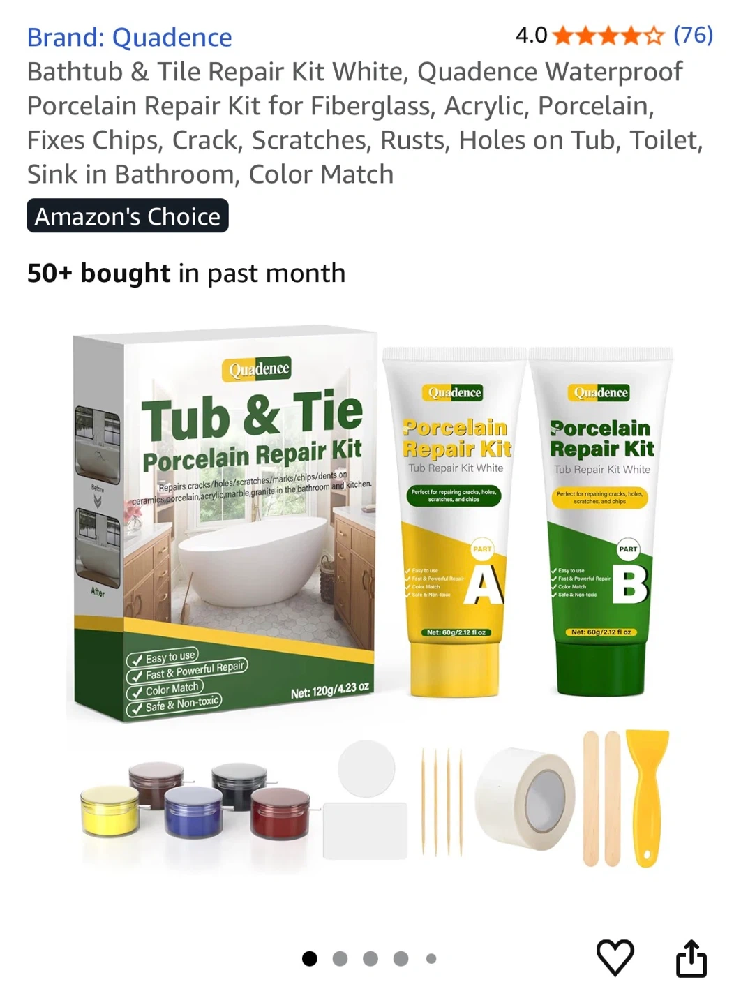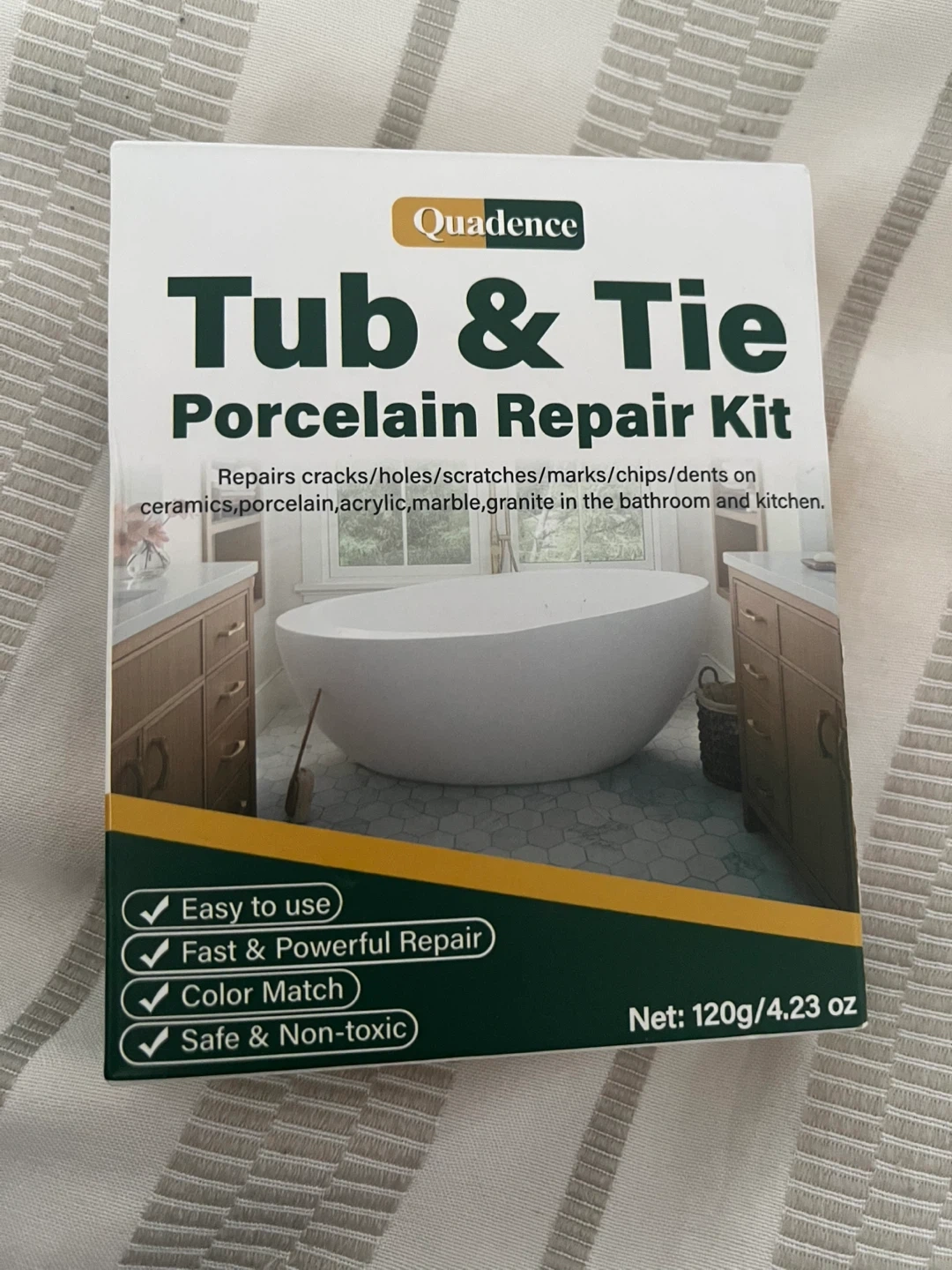 I'm selling a brand new box Quadence Tub & Tile Porcelain Repair Kit. It's great for fixing chips, cracks, scratches, rust, and holes on tubs, toilets, and sinks.