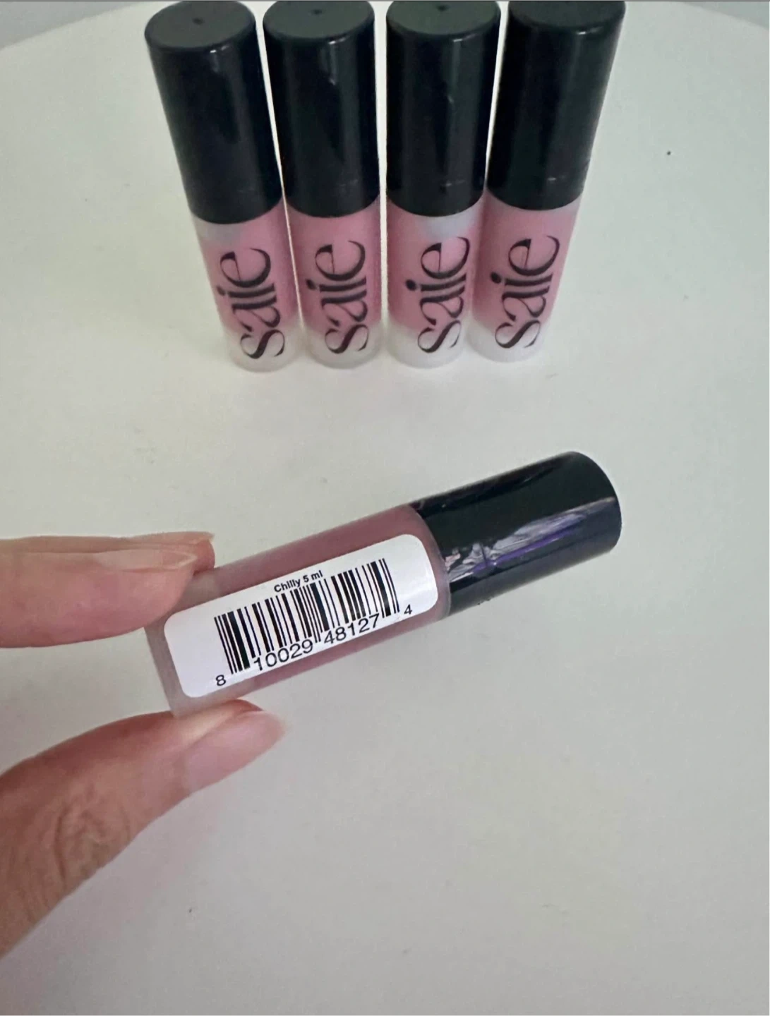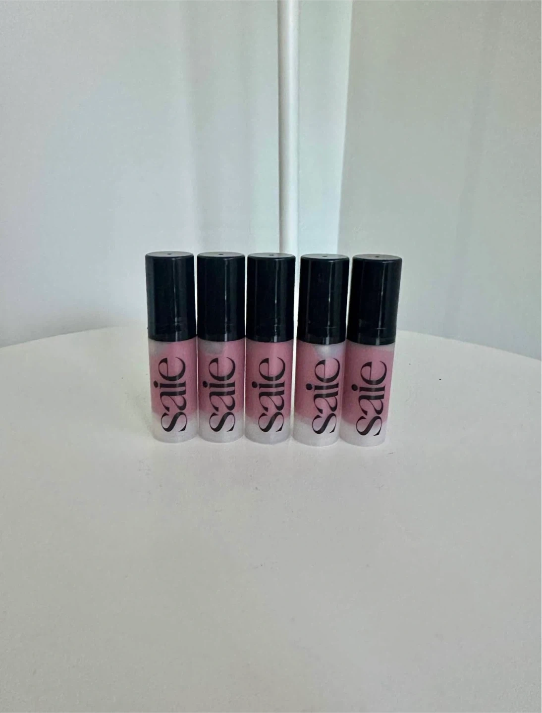 Five mini Saie lip glosses in the shade Chilly. Each gloss is 5ml. These glosses provide a subtle pink tint.
