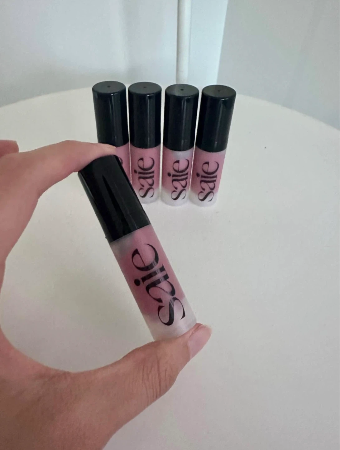 Five mini Saie lip glosses in the shade Chilly. Each gloss is 5ml. These glosses provide a subtle pink tint.