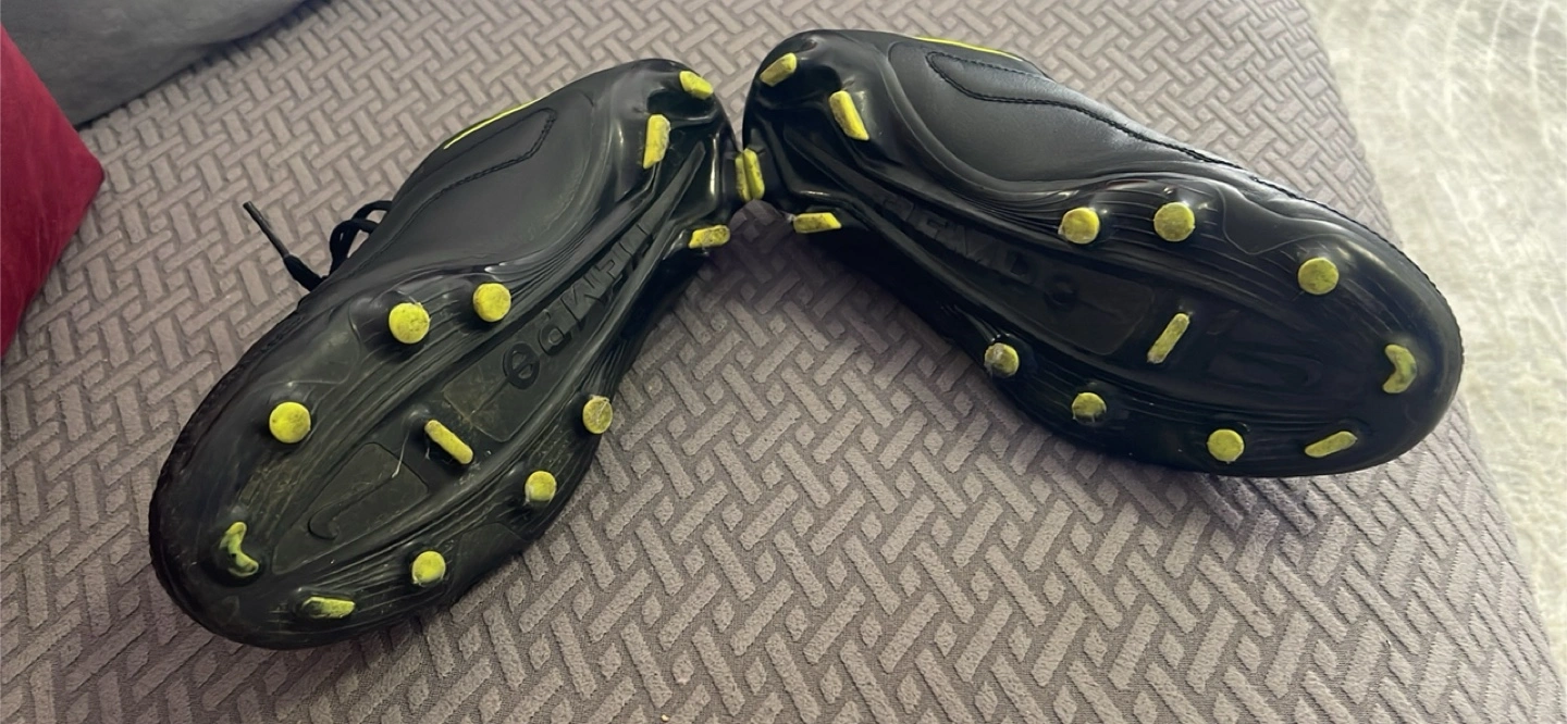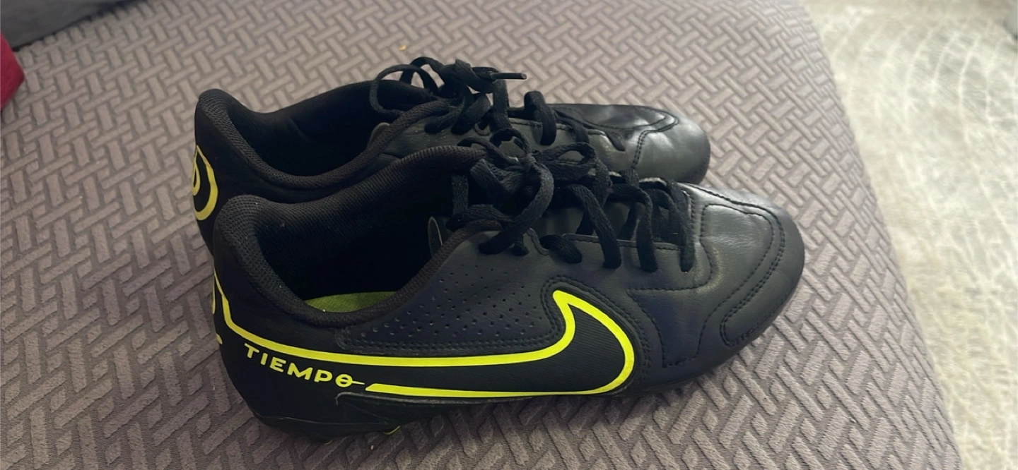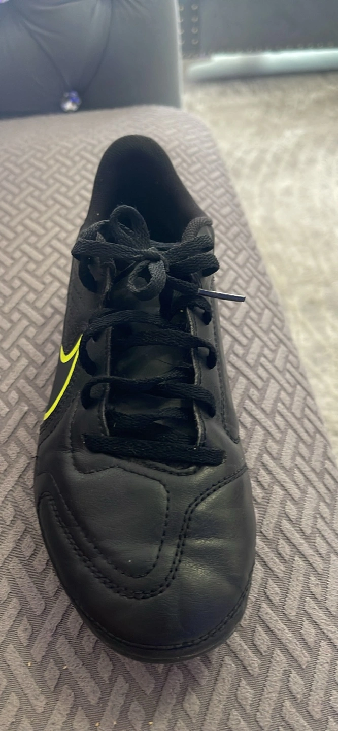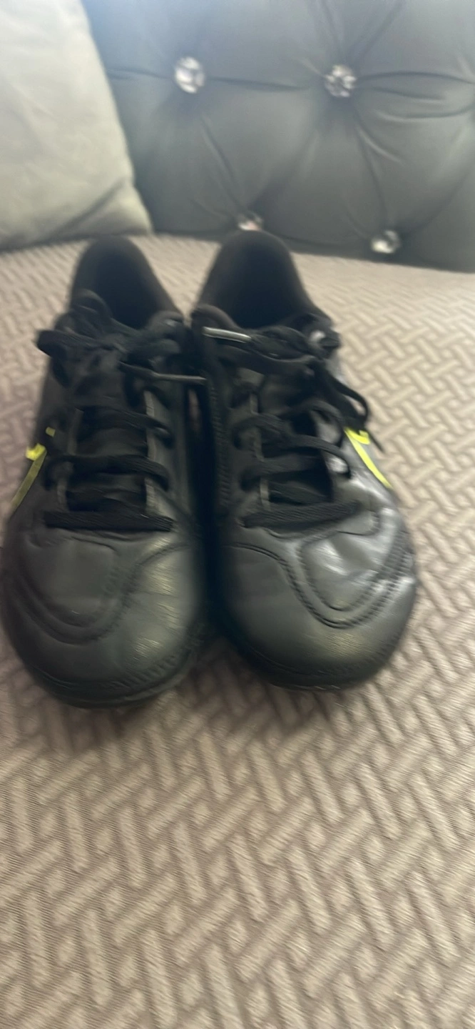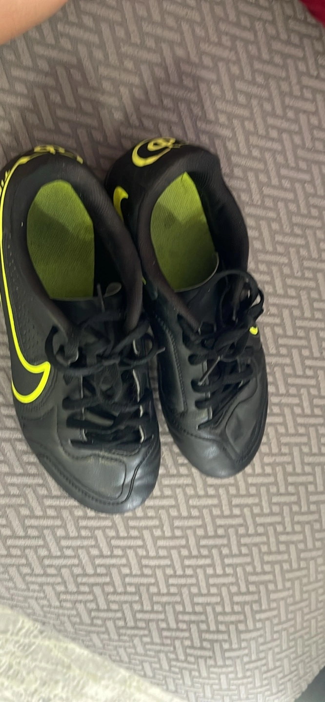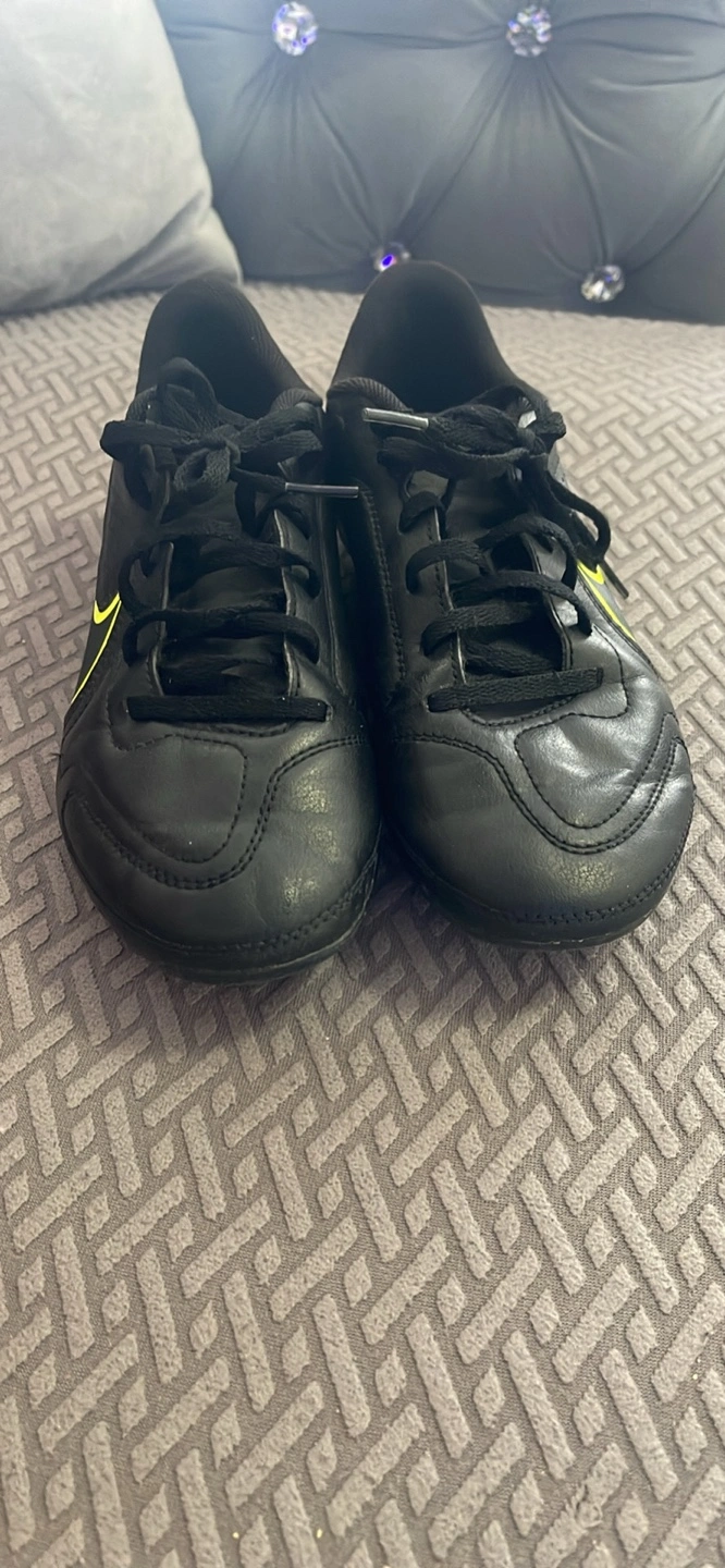 Selling a pair of Nike Tiempo soccer shoes in black with yellow accents! They're in good used condition and ready for the field. Great for kids or adults looking for a reliable pair of cleats