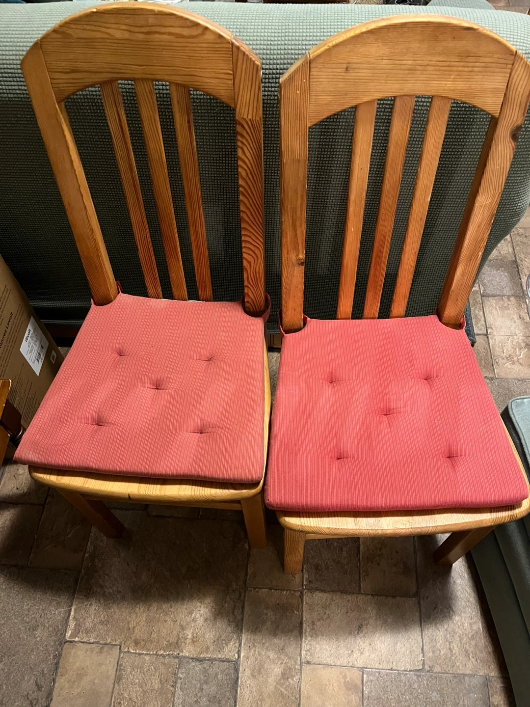 Two wooden chairs with comfortable red tufted cushions. These chairs have a sturdy wooden frame and would fit well in a dining room or kitchen.