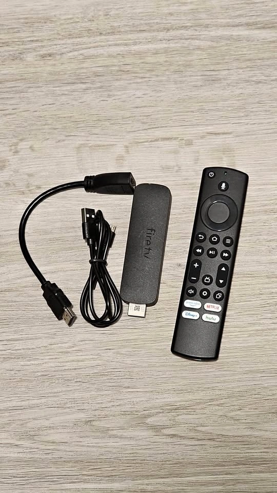 Complete Amazon Fire TV Stick. Has the Fire TV stick itself, the remote control, HDMI extender, and power cable. Ready to plug into your TV for streaming.