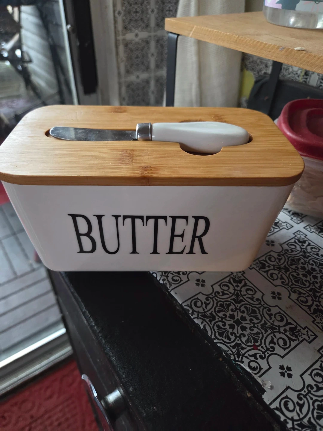 A ceramic butter dish with a bamboo lid and an included butter knife. It's white with black "BUTTER" text. Keeps butter fresh on the counter. 1 pound butter size