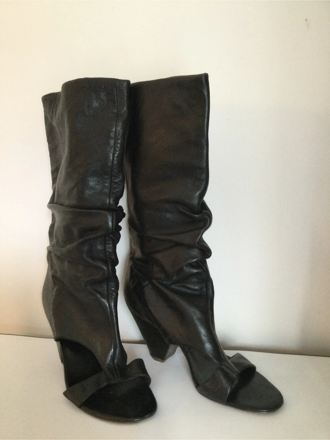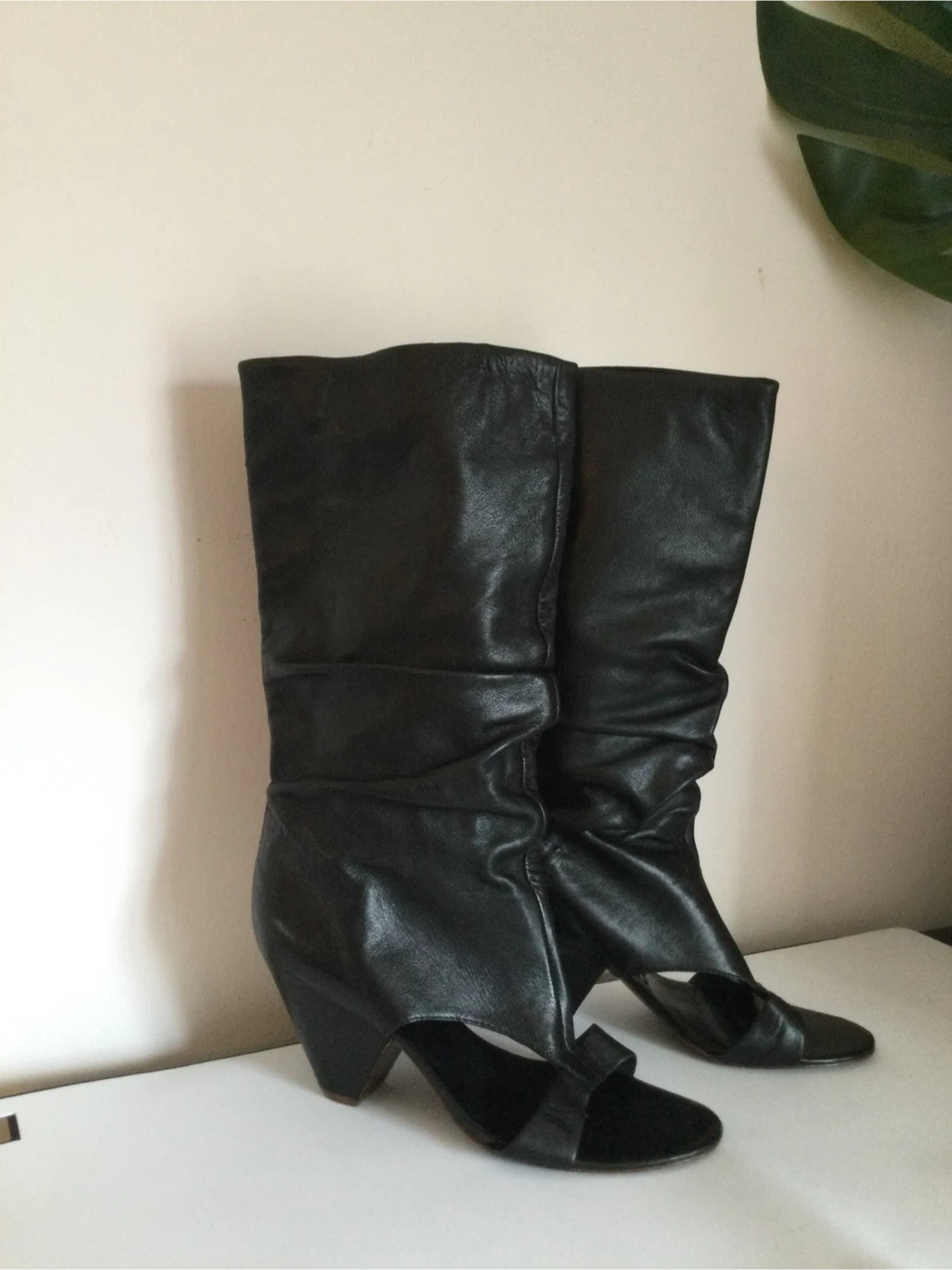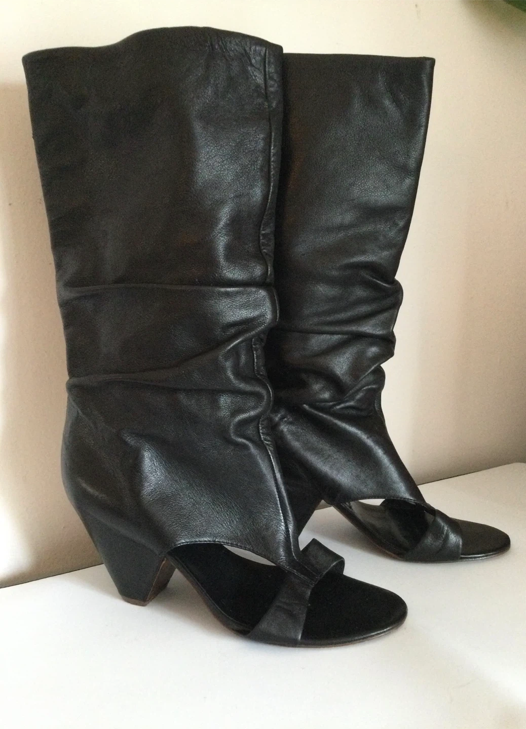 Black leather slouch boots with an open toe and unique heel design. These boots have a ruched shaft for a stylish look. Made from soft genuine leather.