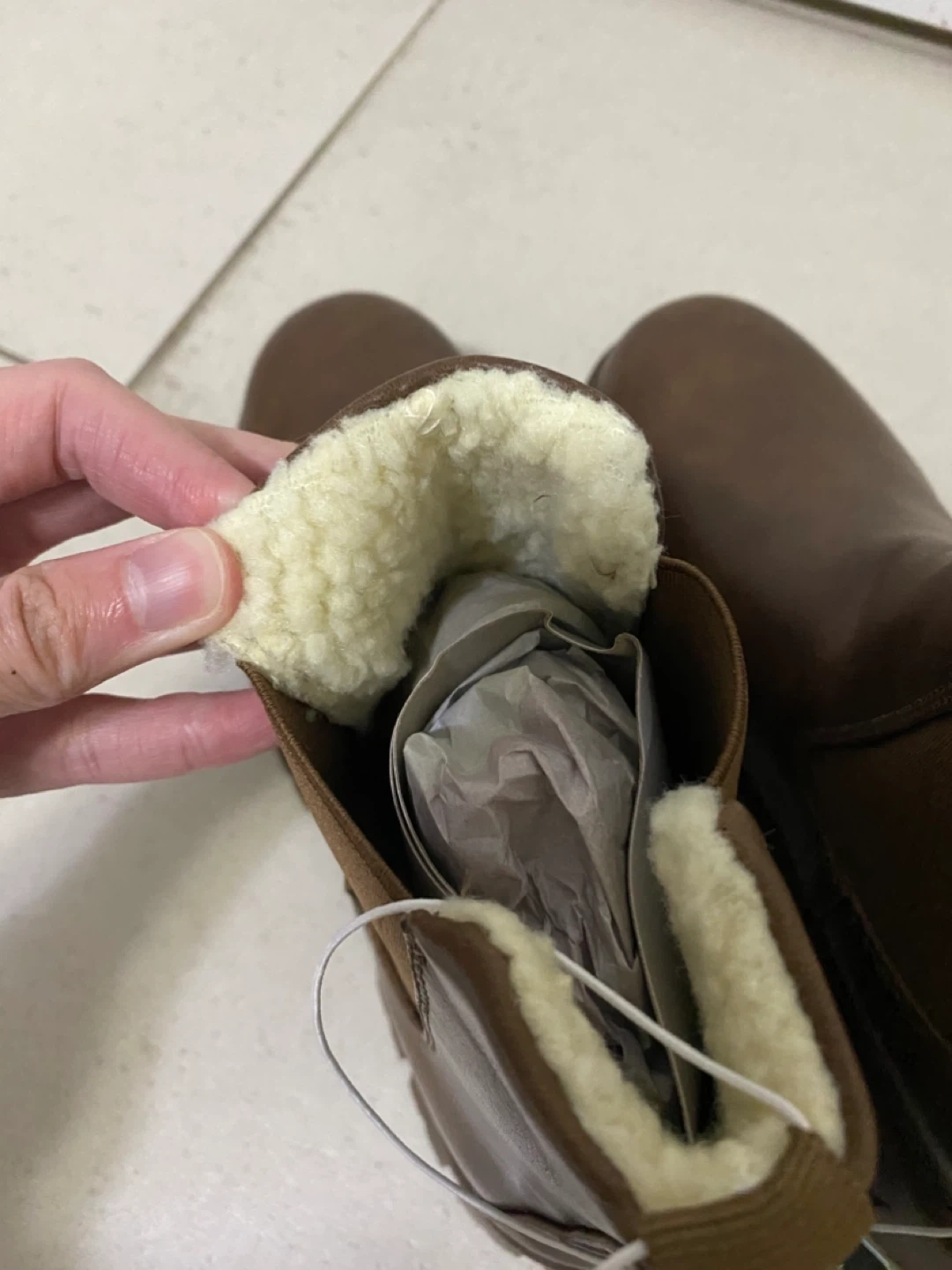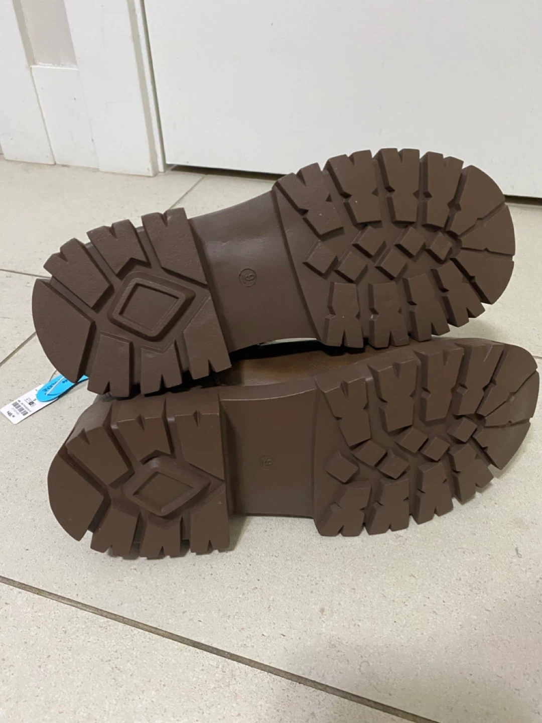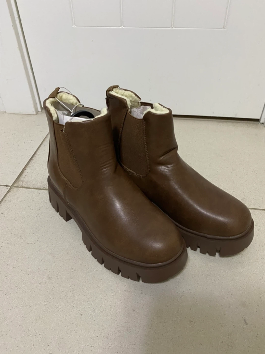 These are new brown faux leather winter boots with a cozy fleece lining. They feature a durable lug sole and elastic side panels for easy on and off. Perfect for keeping your feet warm and dry during colder weather!