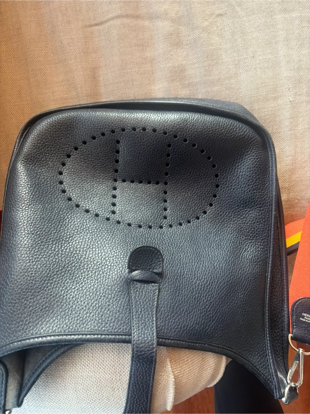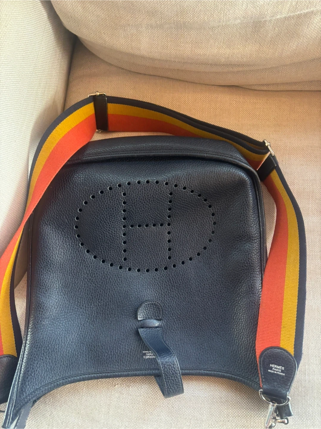 Dark blue leather Hermes Evelyne Bag GM bag with a limited edition strap. It's a classic designer crossbody. Made in France.