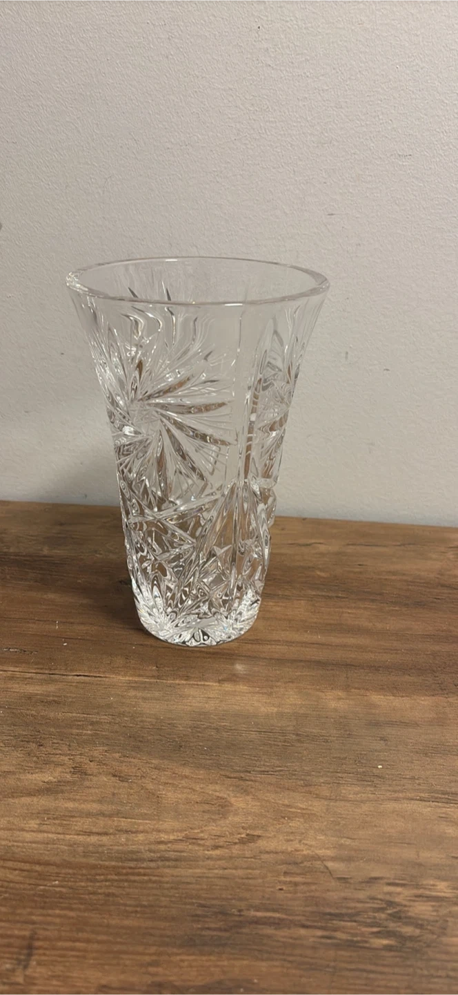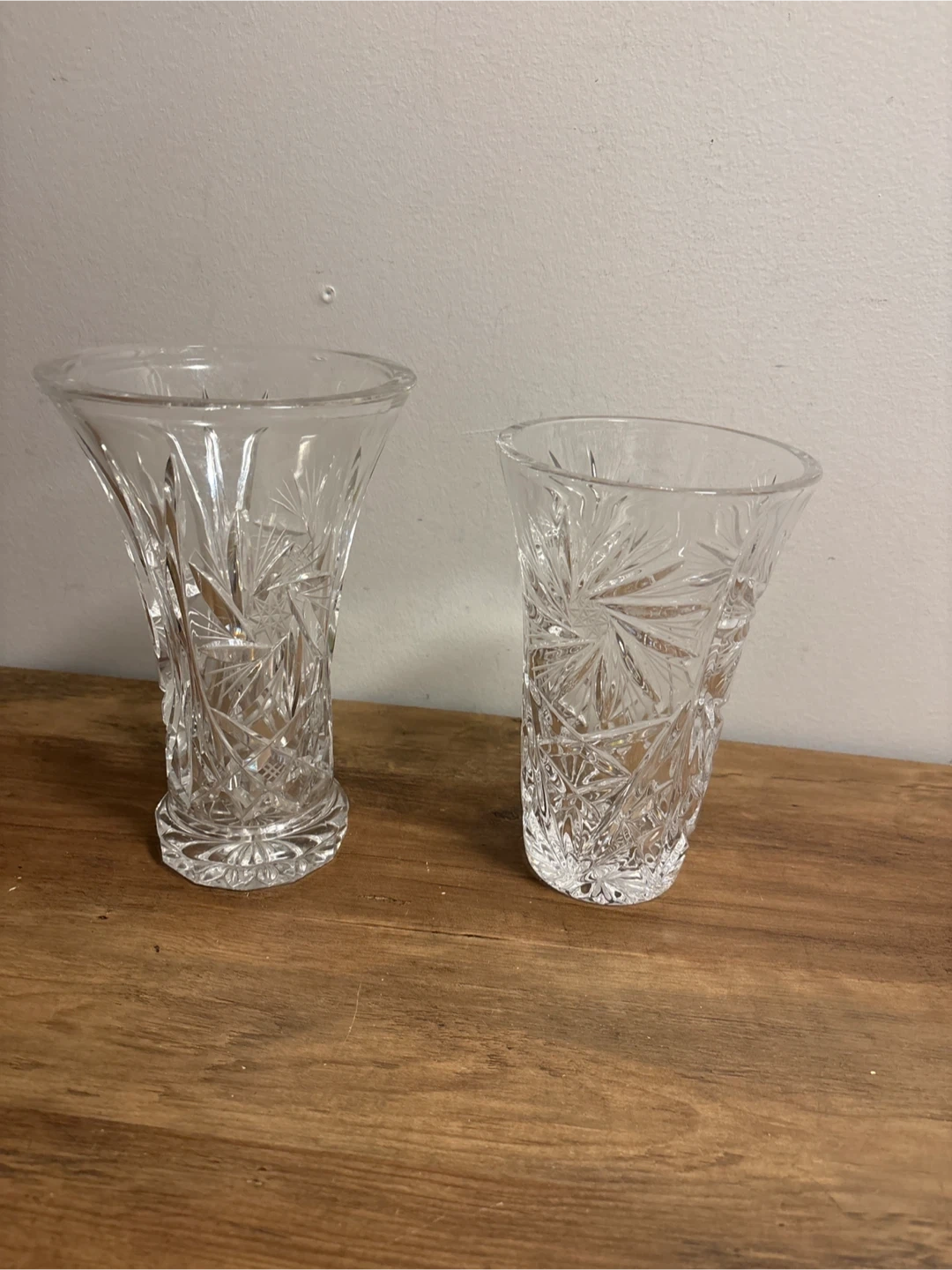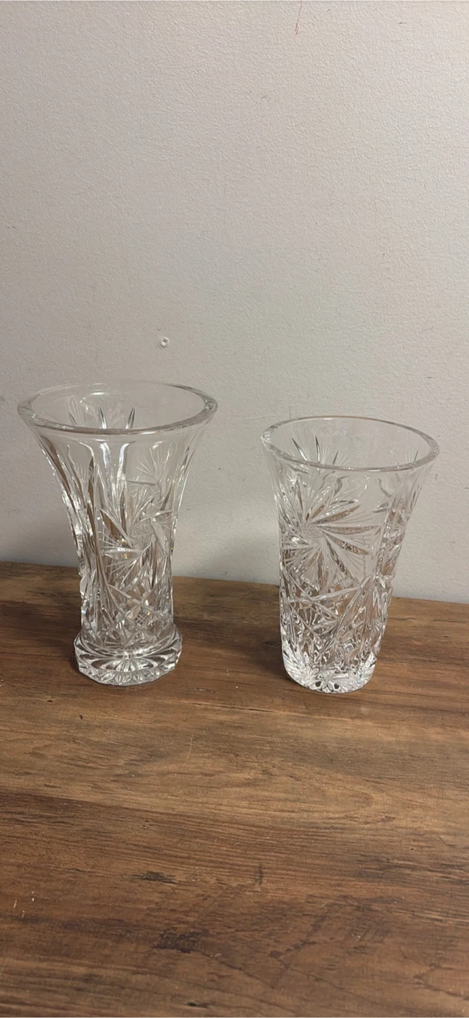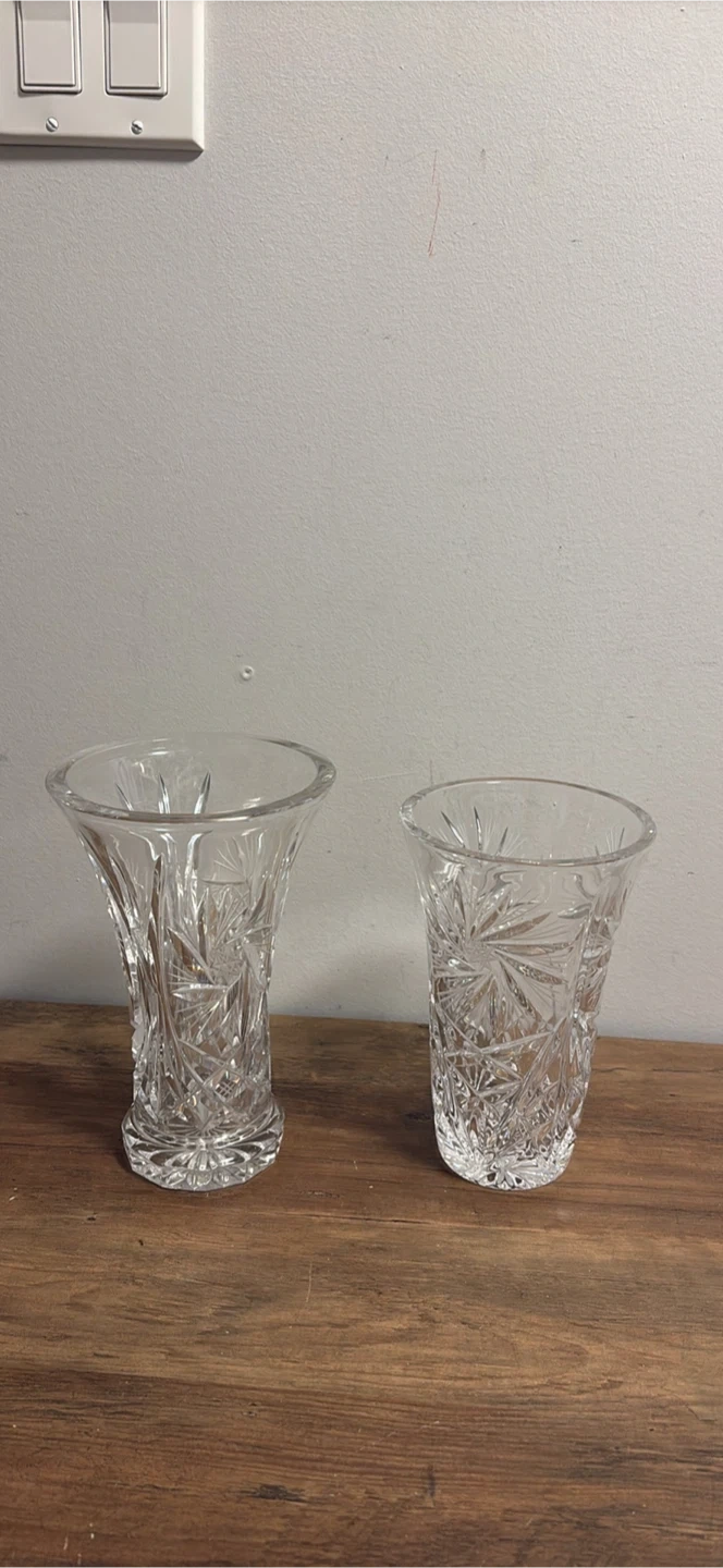 Two clear crystal glass vases with starburst patterns. These vases are perfect for bouquets or as decorative accents.