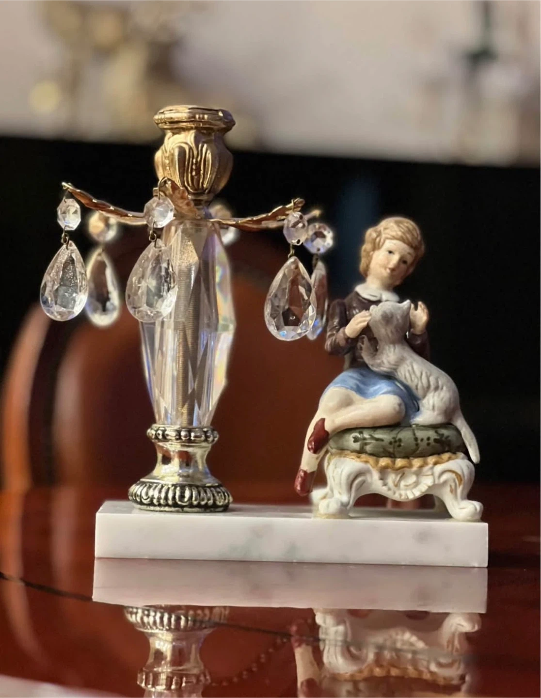 This decorative piece features a ceramic figurine of a child with a dog, paired with a crystal and brass candle holder. It's mounted on a white marble base. Adds a touch of elegance to any room!
