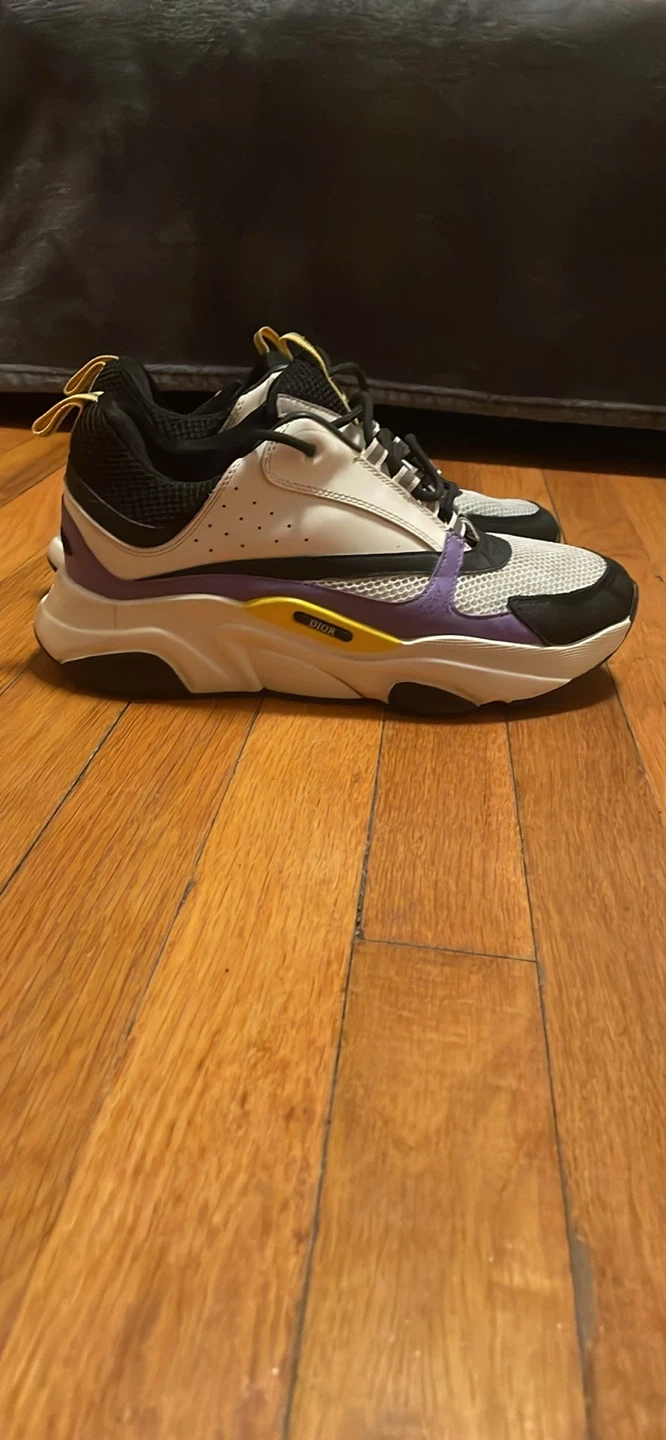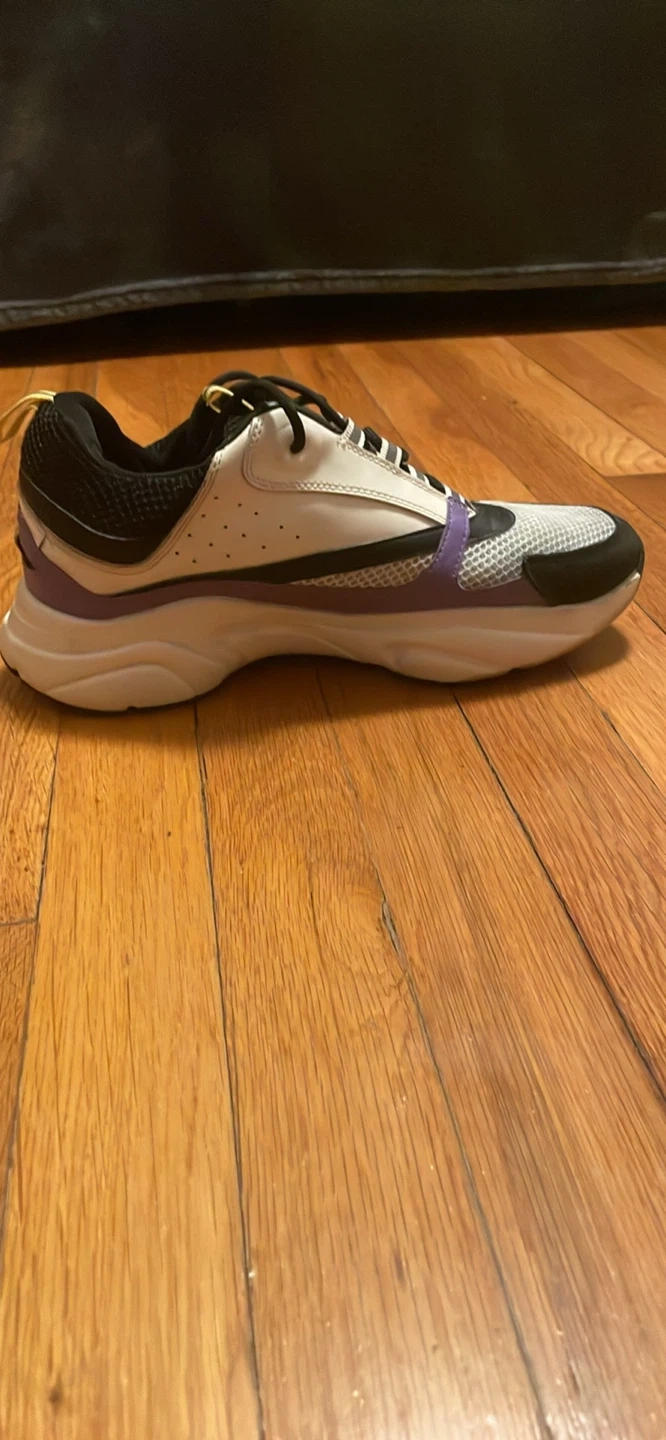 Selling a pair of Dior sneakers. They feature a stylish design with white, black, and purple accents. These sneakers are perfect for adding a touch of luxury to your casual outfits!