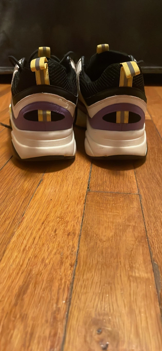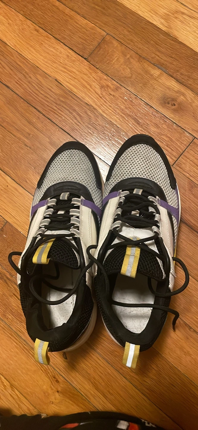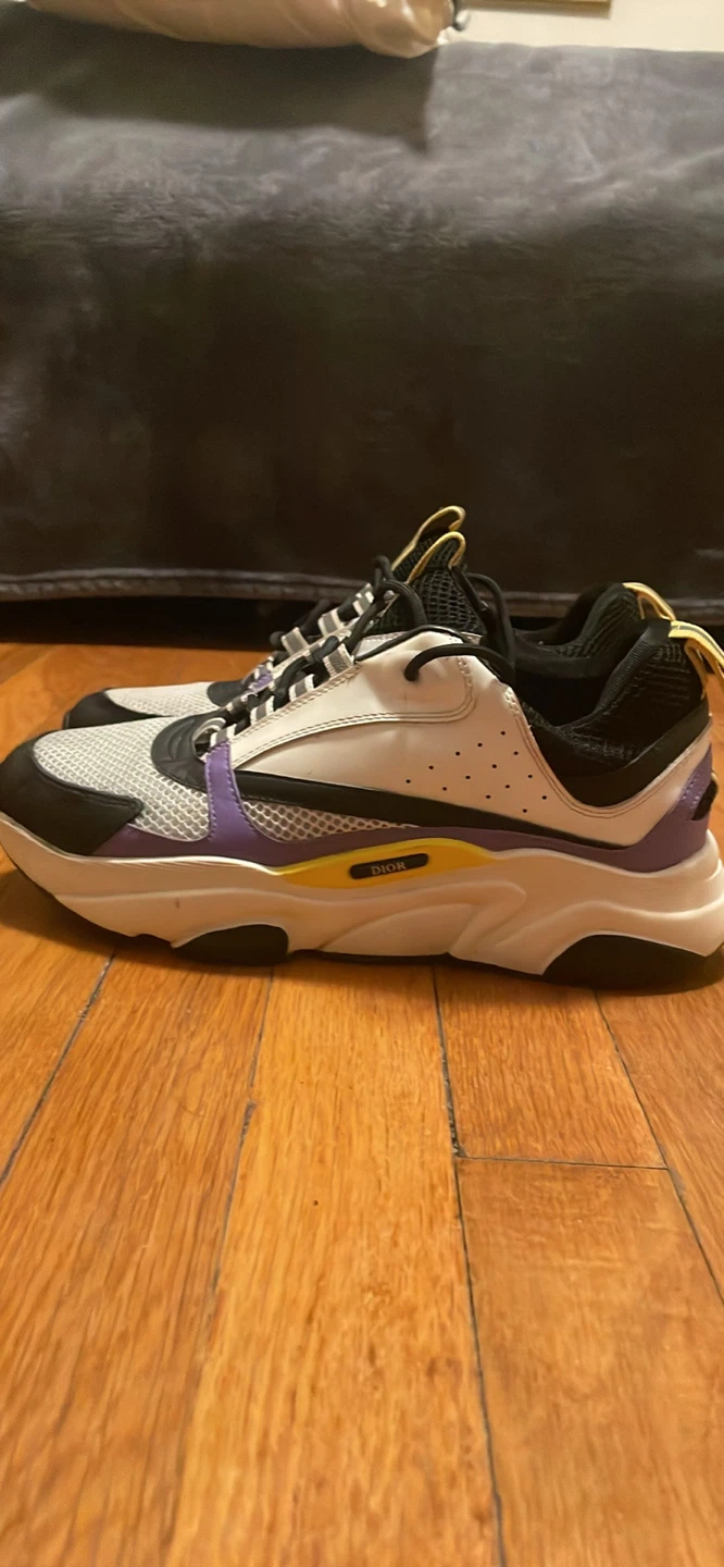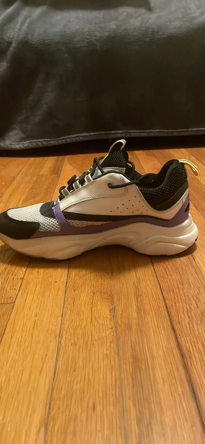 Selling a pair of Dior sneakers. They feature a stylish design with white, black, and purple accents. These sneakers are perfect for adding a touch of luxury to your casual outfits!