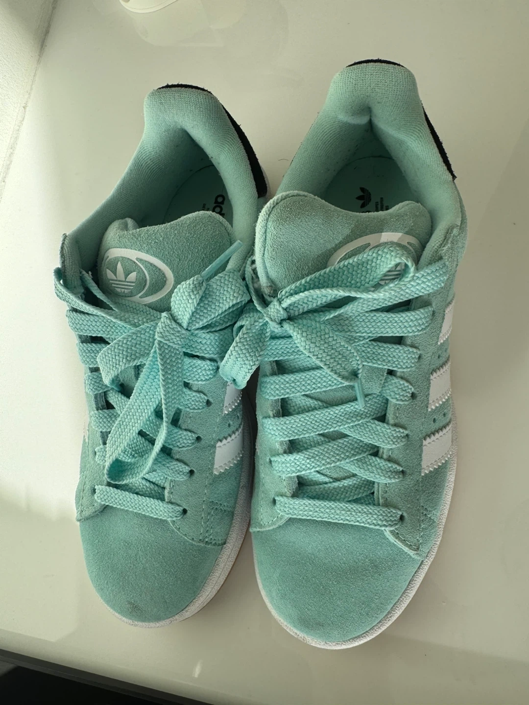 These Adidas Campus sneakers are a stylish mint green colour. They feature the classic Adidas three stripes on the sides. Perfect for casual wear, these shoes are a great addition to any wardrobe!