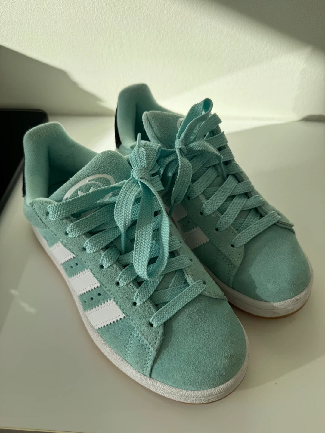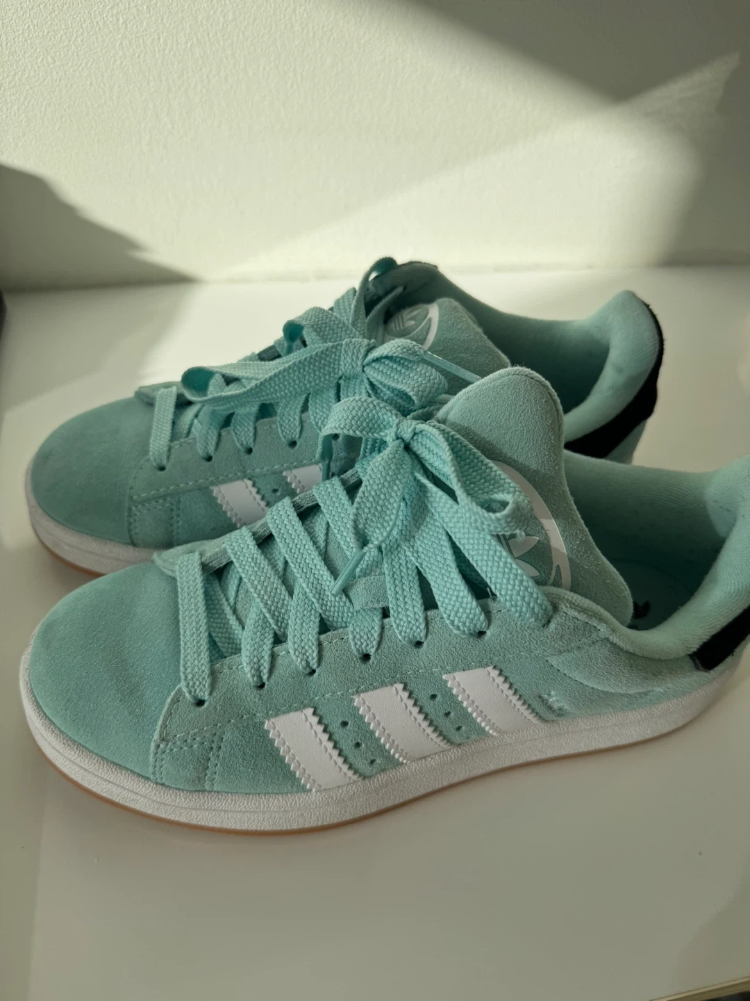 These Adidas Campus sneakers are a stylish mint green colour. They feature the classic Adidas three stripes on the sides. Perfect for casual wear, these shoes are a great addition to any wardrobe!