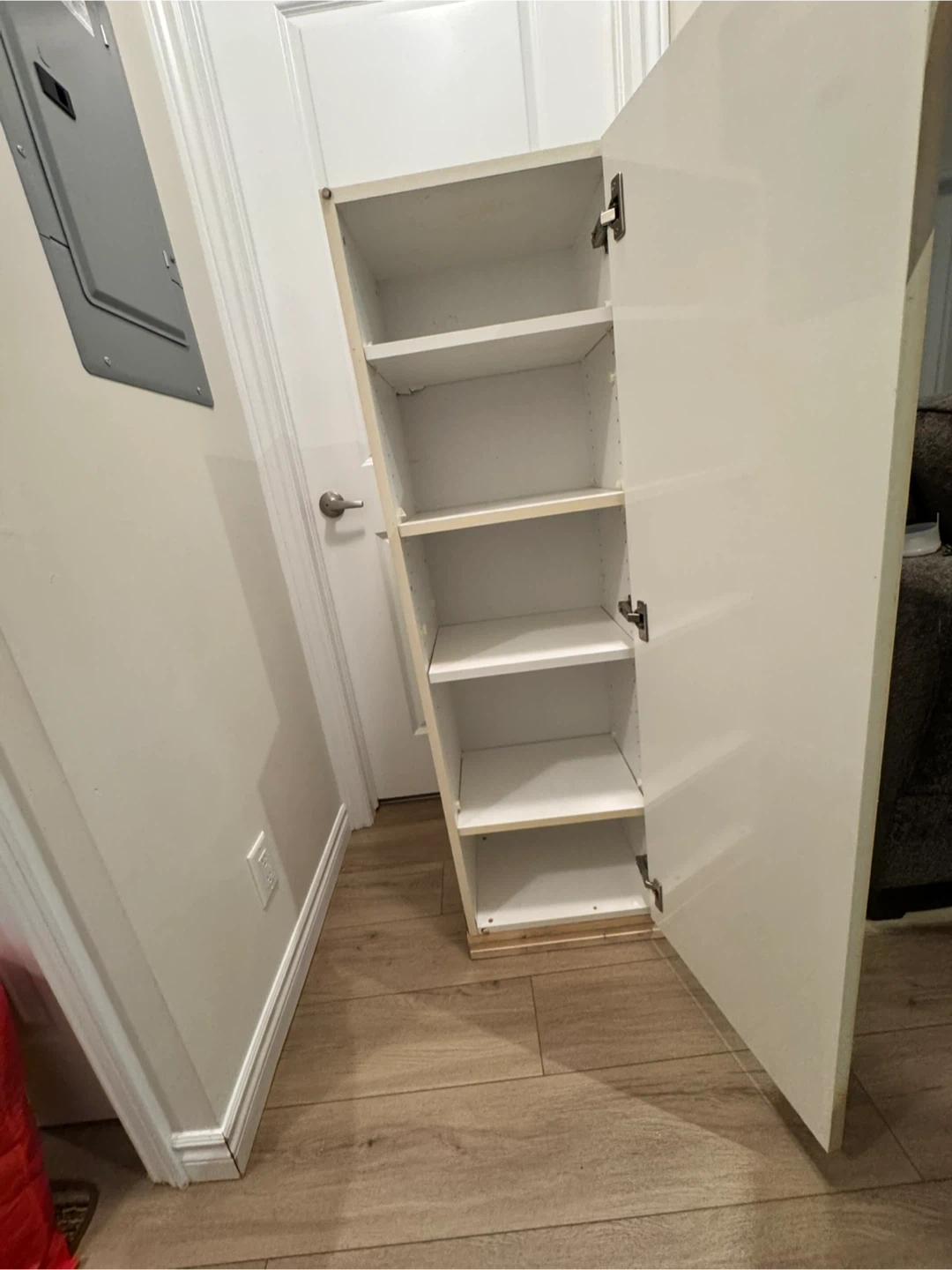 Selling a white cabinet/shelf. It has multiple shelves for storage and display. Great for organizing books, decor, or other items!