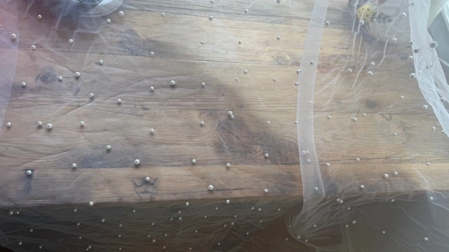 Pearls applied with a scattered effect instead of a pattern giving it a more natural and dramatic look. Pearls are studded, not glued, so the are well secured and have more movement.