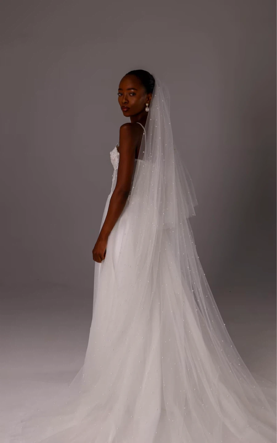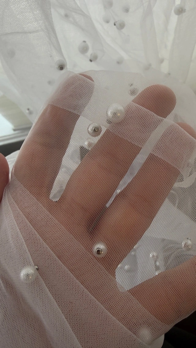 Pearls applied with a scattered effect instead of a pattern giving it a more natural and dramatic look. Pearls are studded, not glued, so the are well secured and have more movement.