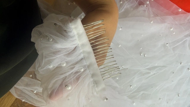 Veil was never worn as it didn’t match my dress. Like any other veil it will require steaming to remove crinkles.