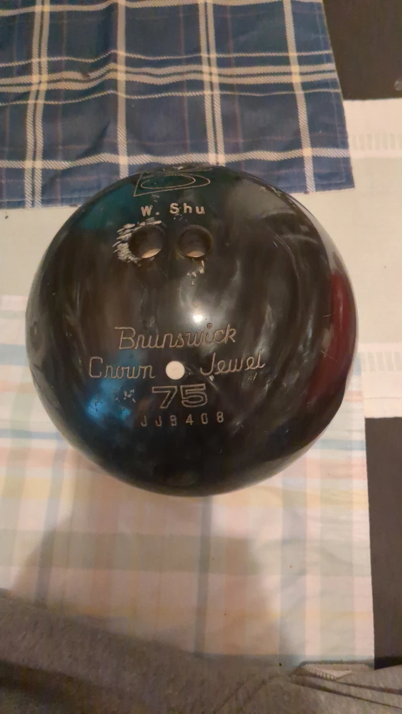 This is a Brunswick Crown Jewel 75 bowling ball. It has W. Shu engraved on it. The ball is dark coloured with a swirling pattern. It has scratches