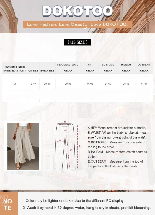 Elevate your style and comfort with these chic Dokotoo Palazzo Pants. Designed for effortless elegance, they feature a high-waisted elastic band with drawstring, spacious side pockets, and a flowing wide-leg cut that’s perfect for any season.