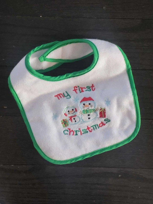 Get ready to celebrate the holidays with this adorable "Baby's First Christmas" bib, perfect for keeping your little one clean and festive! This brand-new bib features a charming Christmas-themed design, complete with cute snowmen and colourful embroidery, making it a delightful accessory for those special Christmas moments. It’s ready to make your baby's first Christmas even more memorable! Cash accepted.