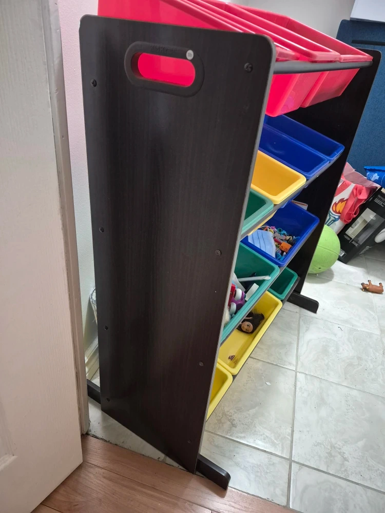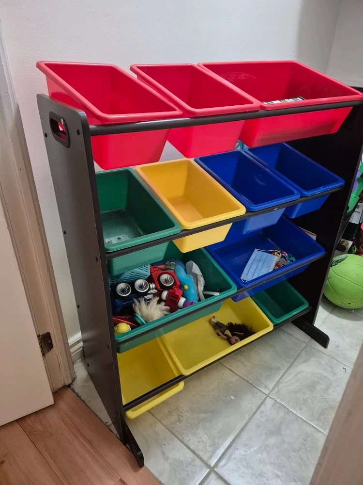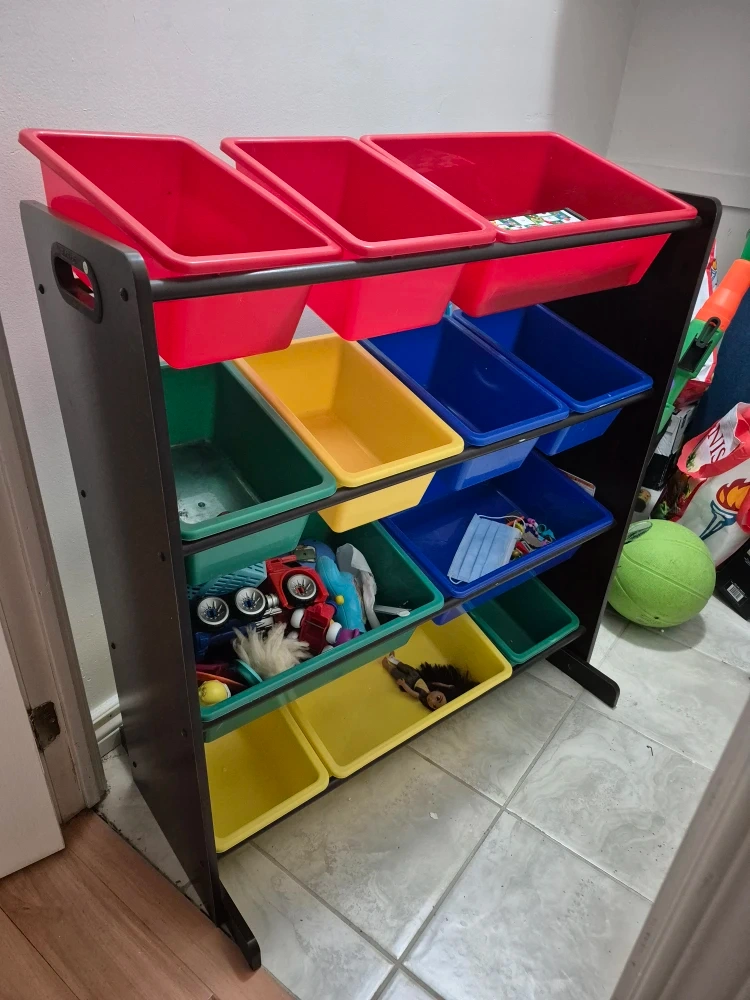 This toy organizer features a dark brown frame with multiple storage bins in red, blue, yellow, and green. It's perfect for keeping a child's room tidy. The bins are removable for easy access to toys. Still like new perfect condition