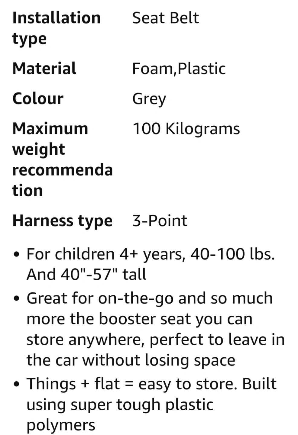 The Mifold One is a compact and portable booster seat. It's made of foam and plastic and uses a 3-point harness. This seat is suitable for children 4 years and older, weighing between 40-100 lbs and 40-57 inches tall.