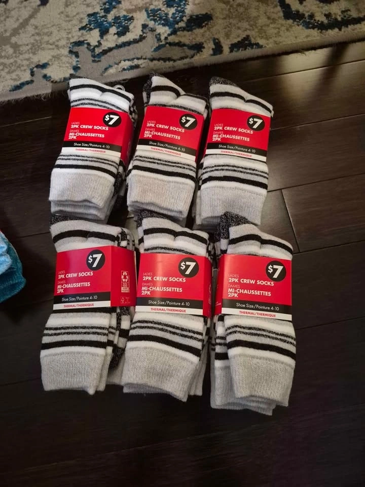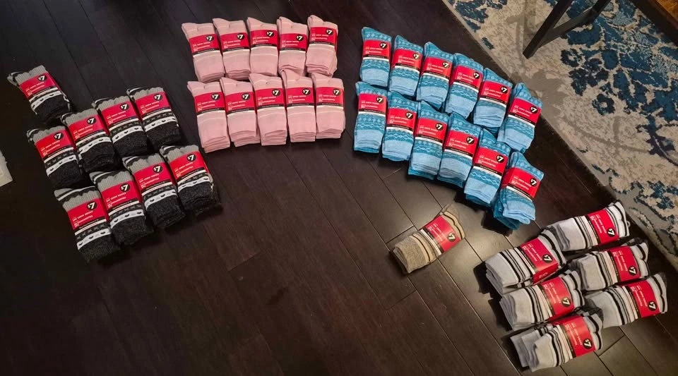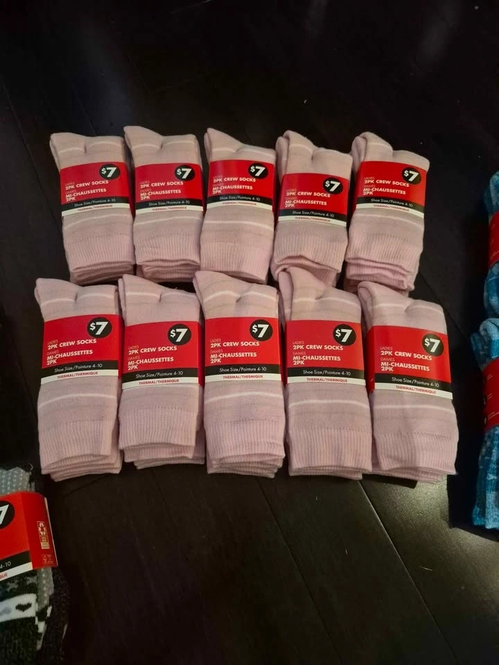 Brand new Derry & McLaughlin thermal crew socks. Each pack contains 2 pairs. Available quantities and colors: 9 Black/Grey Heart, 10 Pink, 14 Blue, 6 Black/Grey Striped, 1 Brown Striped. Price: $3 for 1 pack, $5 for 2 packs.