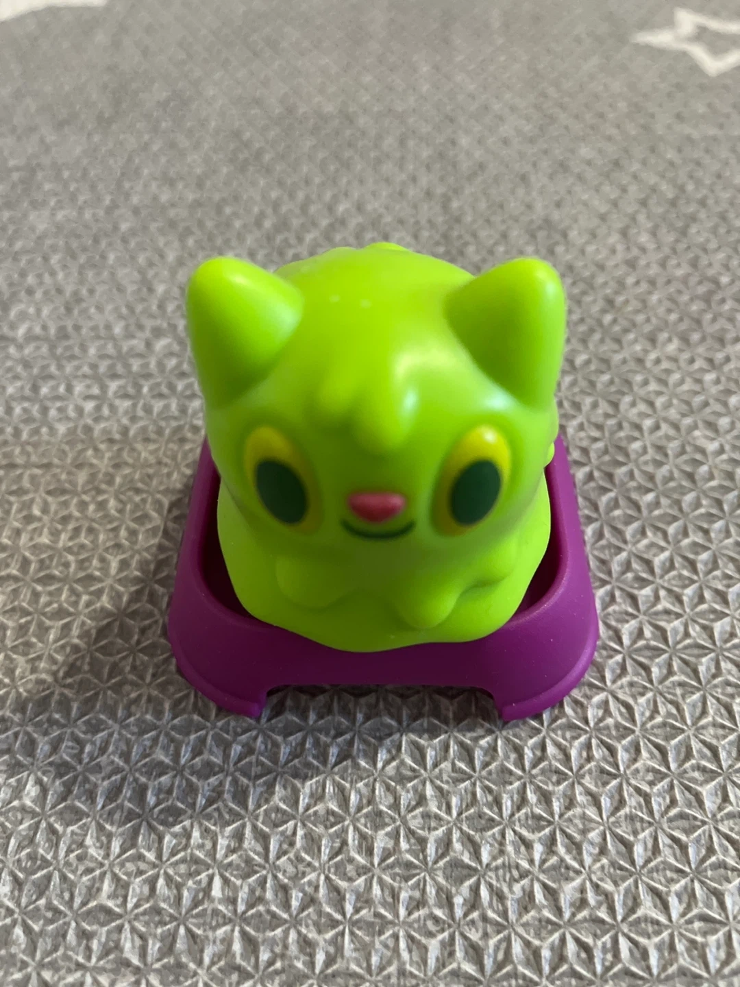 This is a cute green cat toy with big yellow and green eyes and a pink nose. It sits on a purple base. It's a fun little collectible toy!