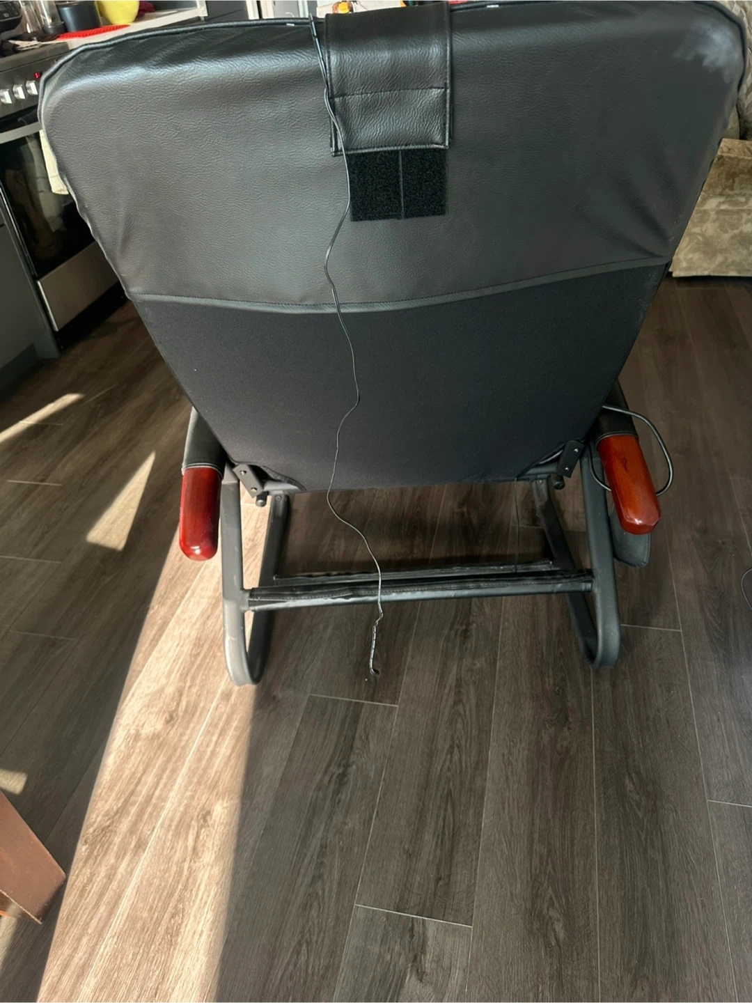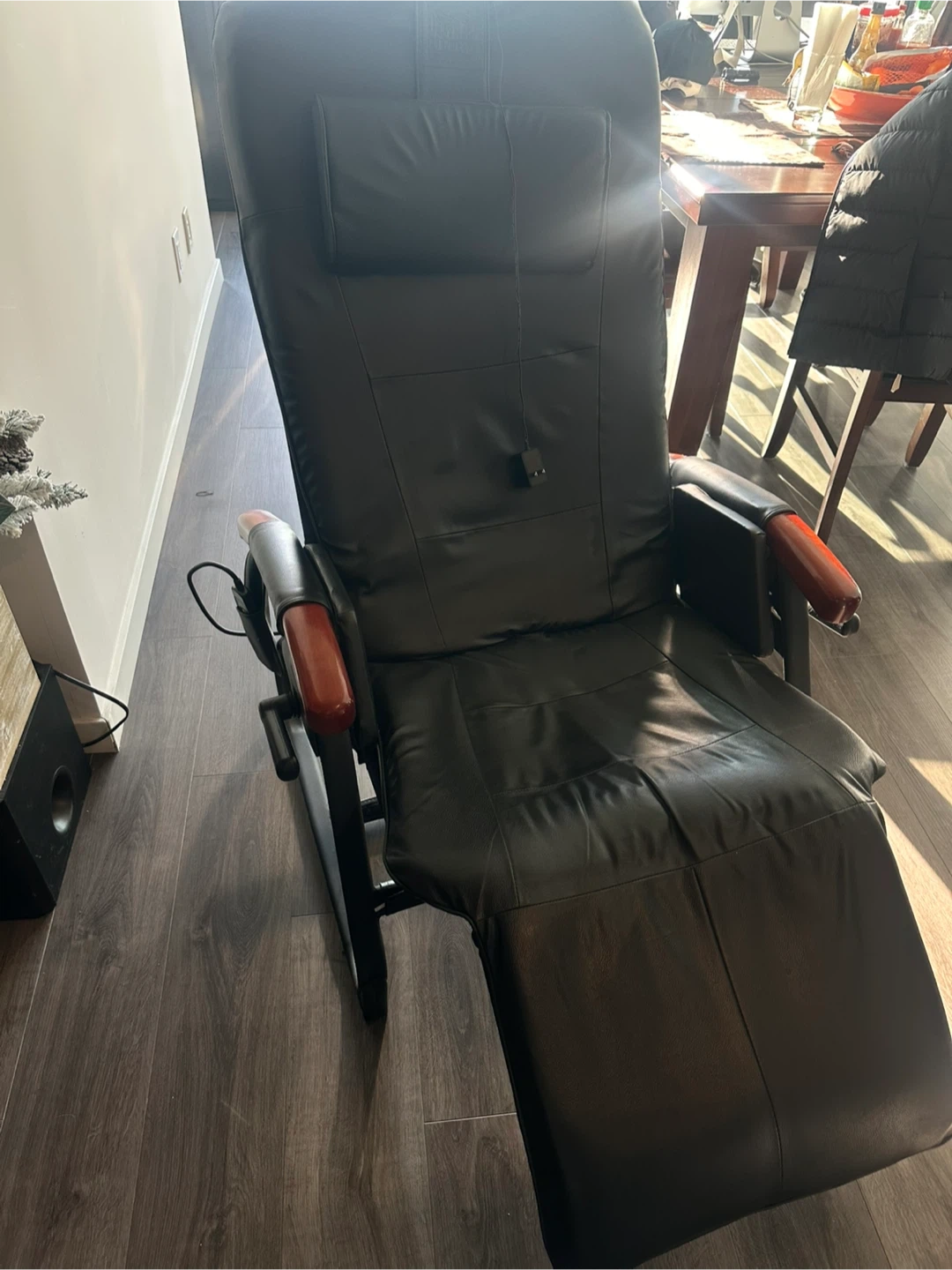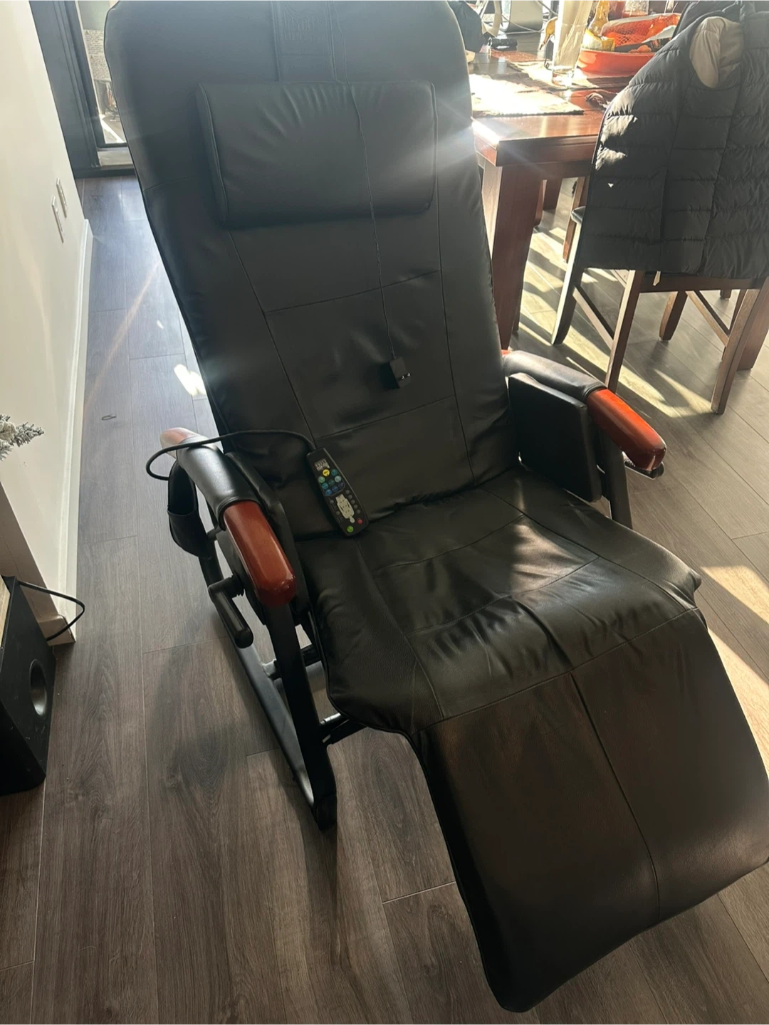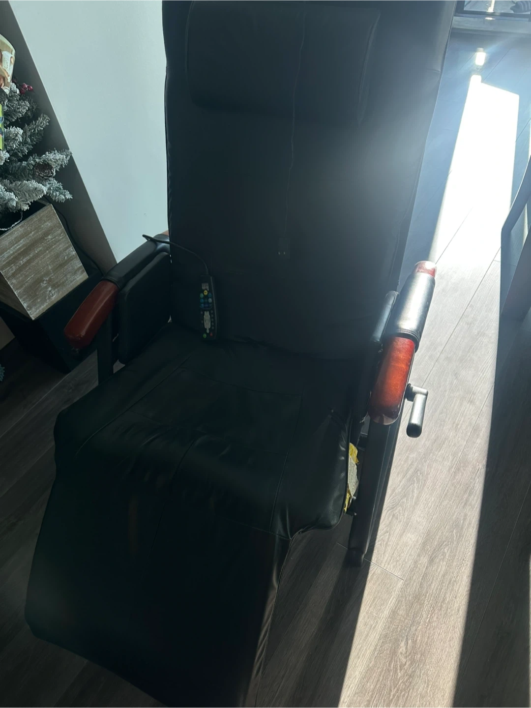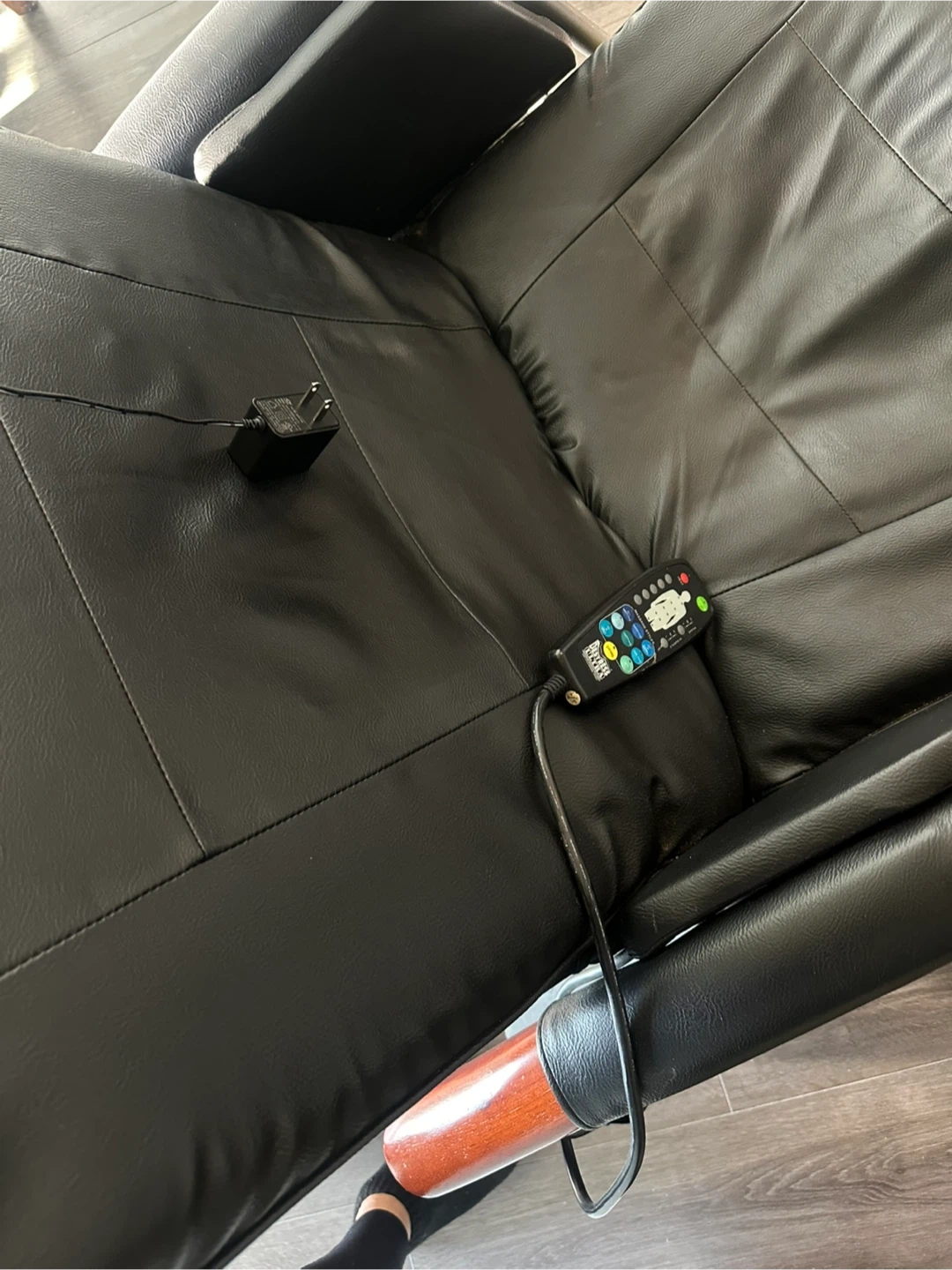 This black leather recliner offers a relaxing massage experience. It's made with durable faux leather and has wooden armrest accents. Includes a remote for easy control of massage functions.