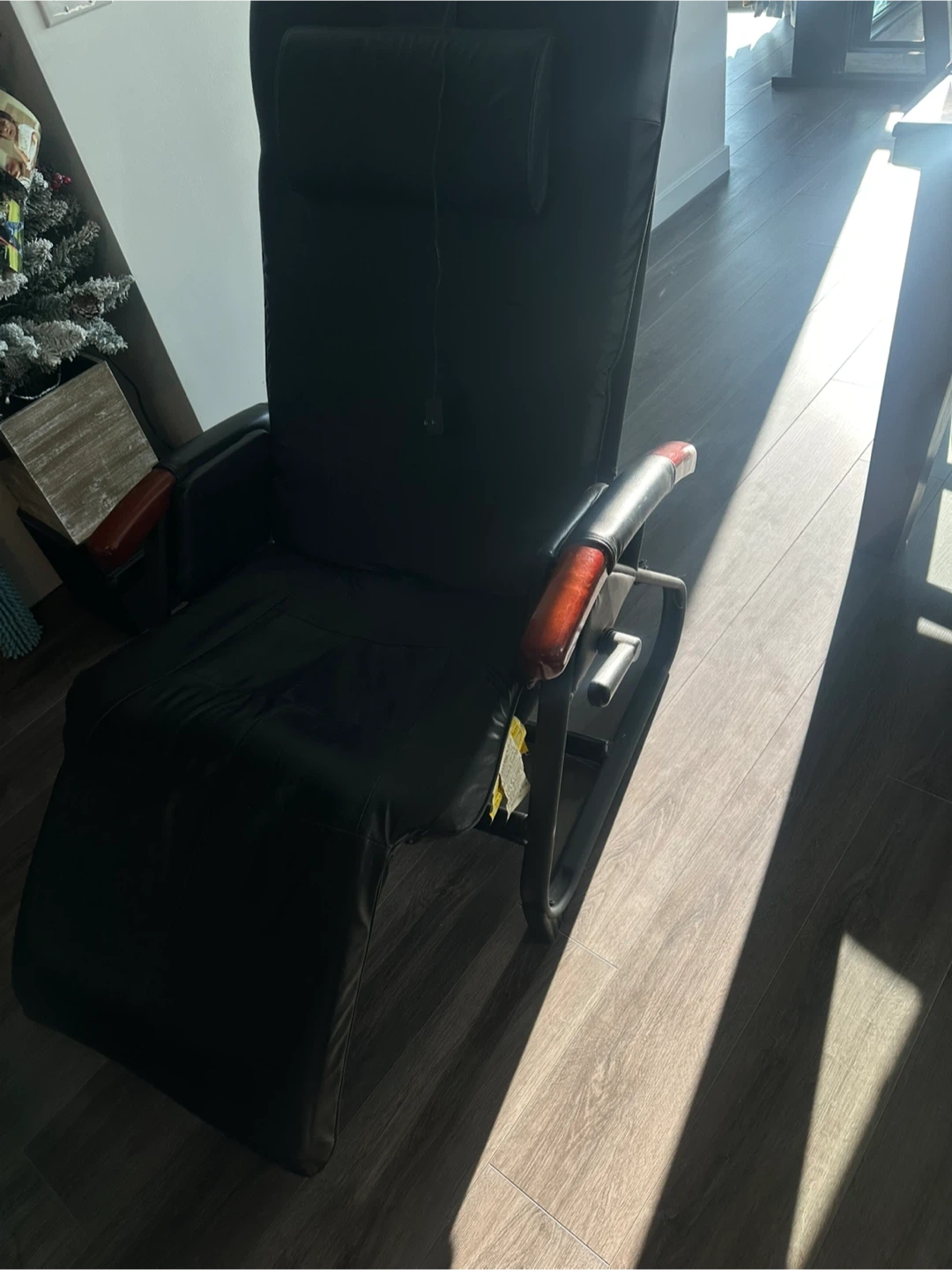This black leather recliner offers a relaxing massage experience. It's made with durable faux leather and has wooden armrest accents. Includes a remote for easy control of massage functions.