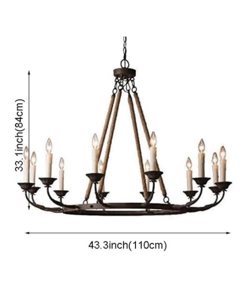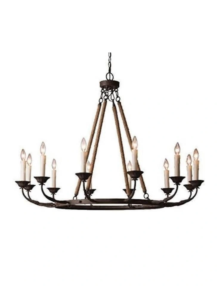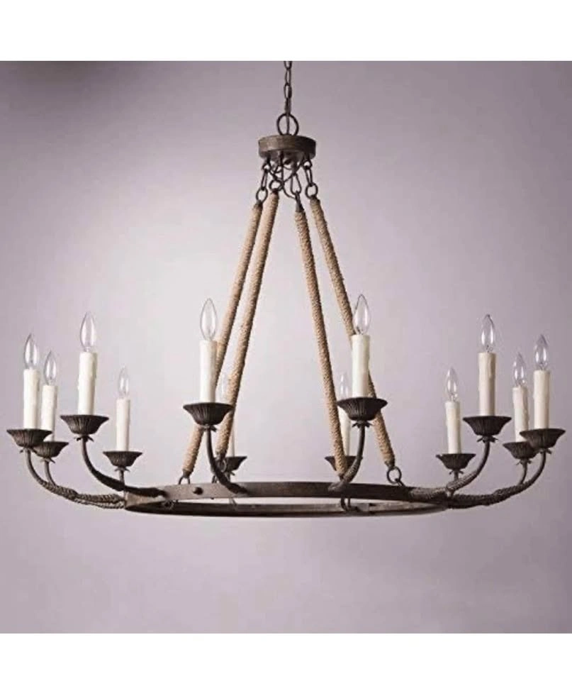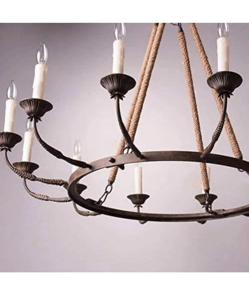 Bold and masculine, the 12-lights chandelier gets a slight nautical twist with thick rope detailing. Four jute rope wrapped rods support a rustic ring giving this chandelier an authentic rustic revival style. Eight candles sit atop leaf accented arms and provide plenty of illumination.