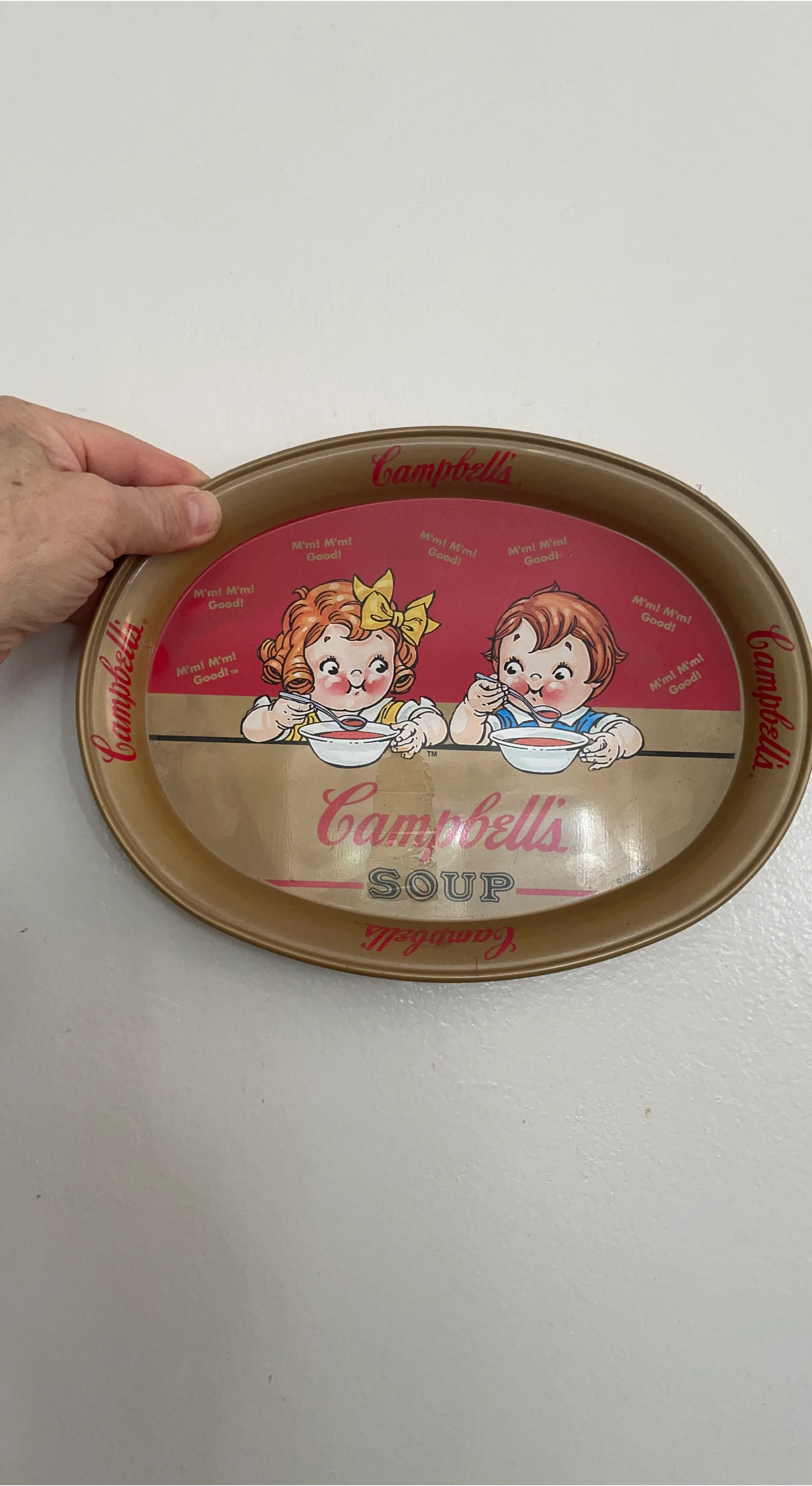 Selling a vintage Campbell's Soup metal tray! It features the classic Campbell's branding with cute illustrations of kids enjoying soup. The tray is perfect for adding a touch of nostalgia to your kitchen or collection. © 1998 CSC