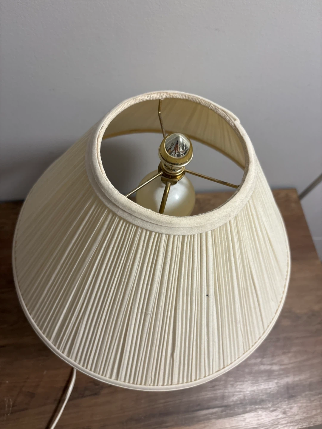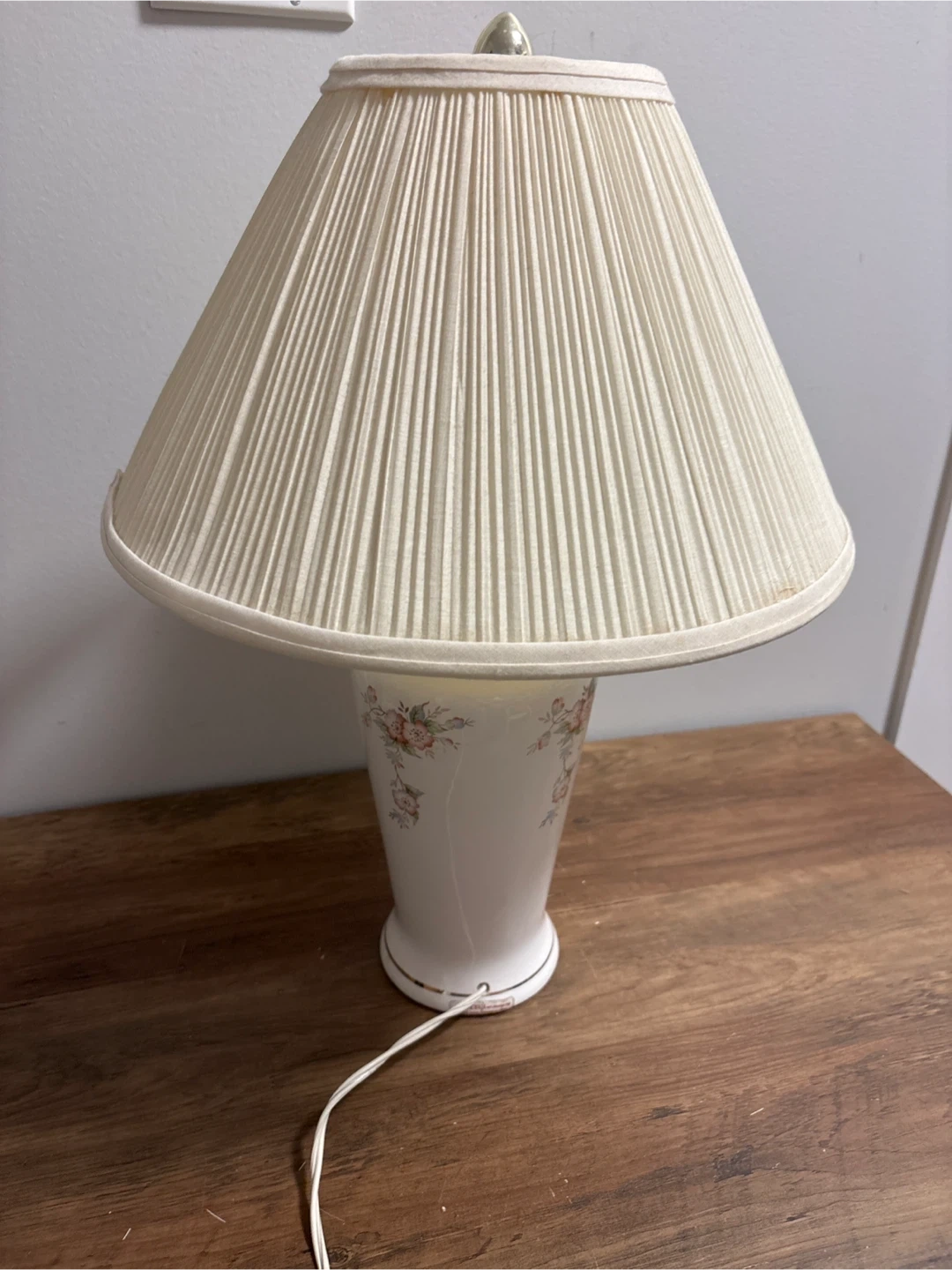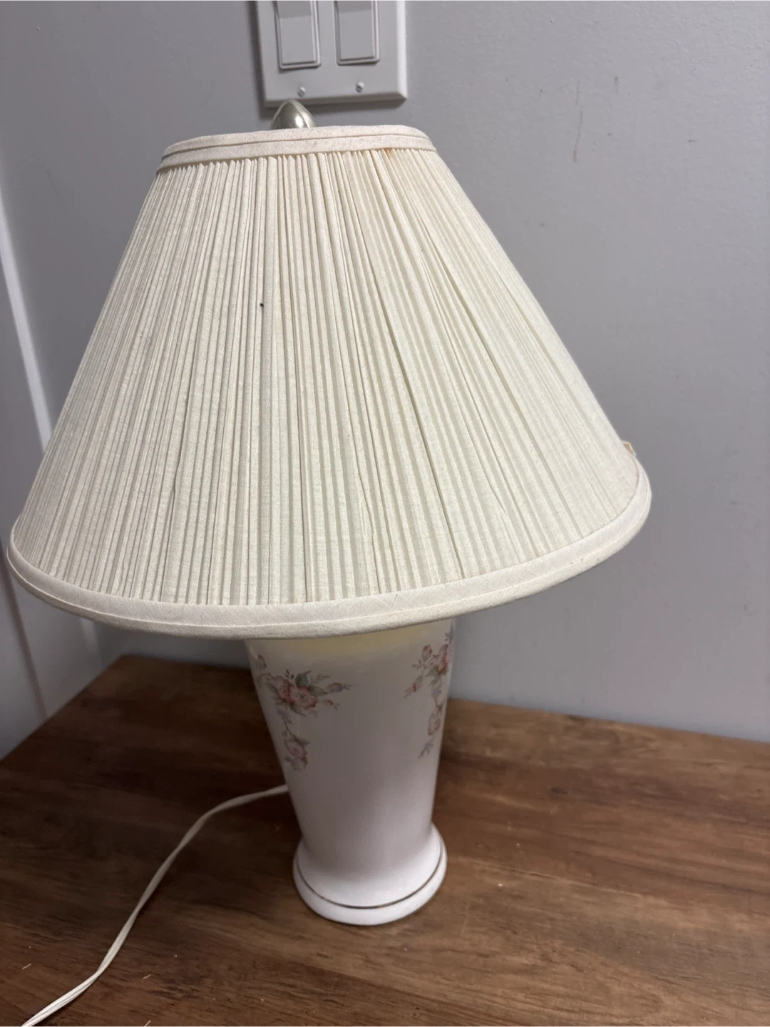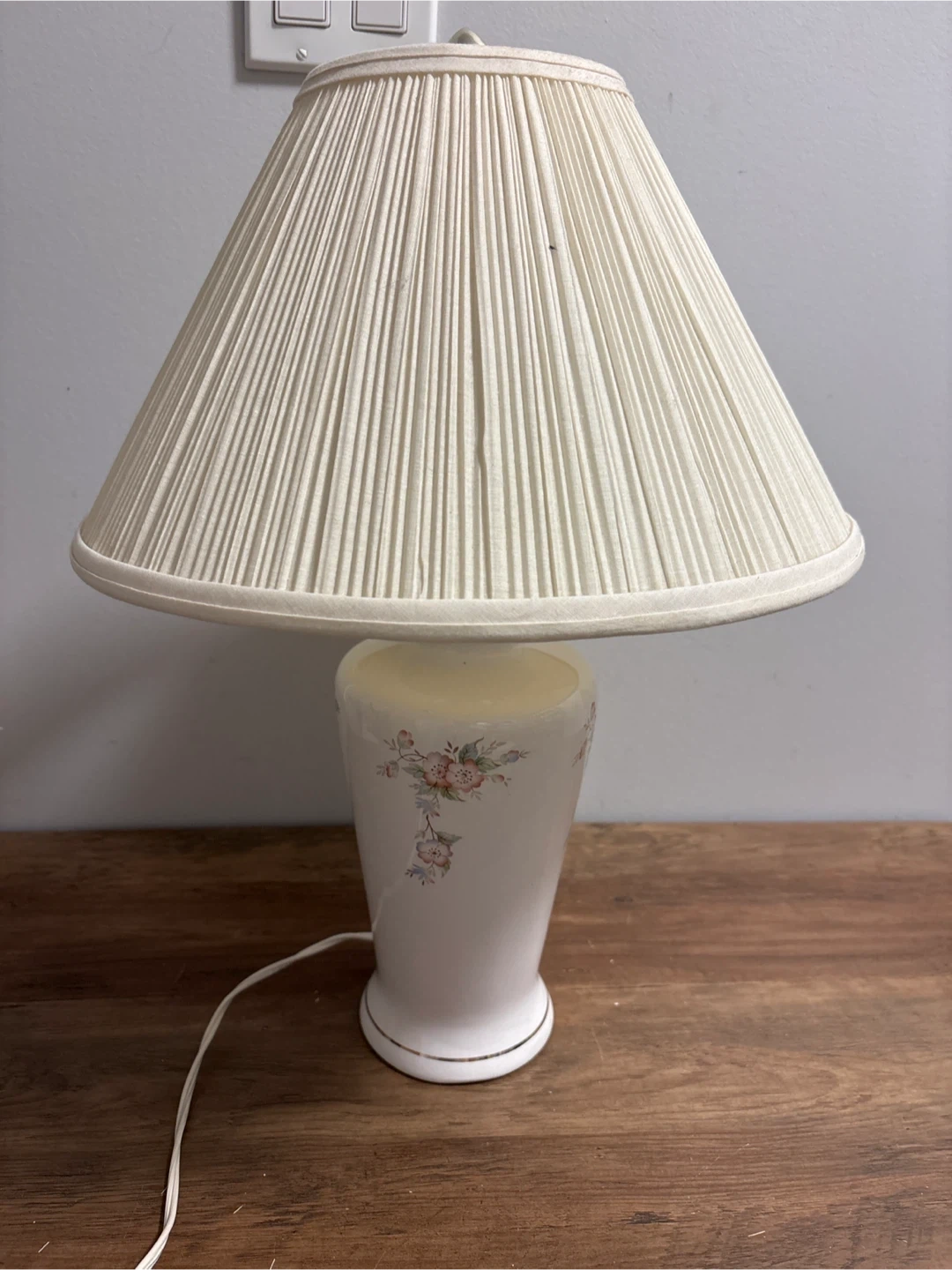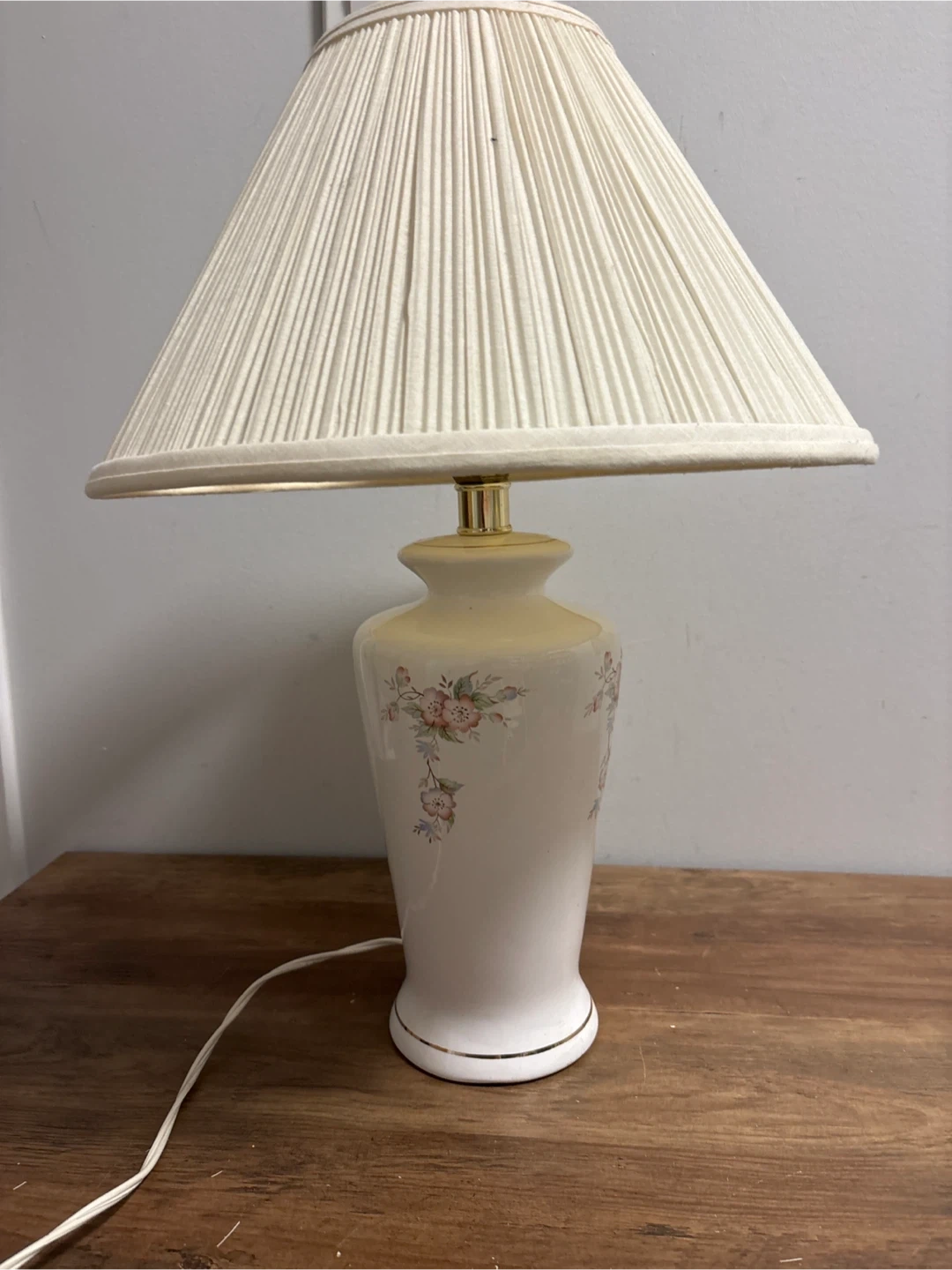This charming table lamp features a white ceramic base decorated with a delicate floral pattern. It comes with a pleated fabric lampshade that adds a touch of elegance. The lamp is in good working condition and would suit a bedside table or living room.