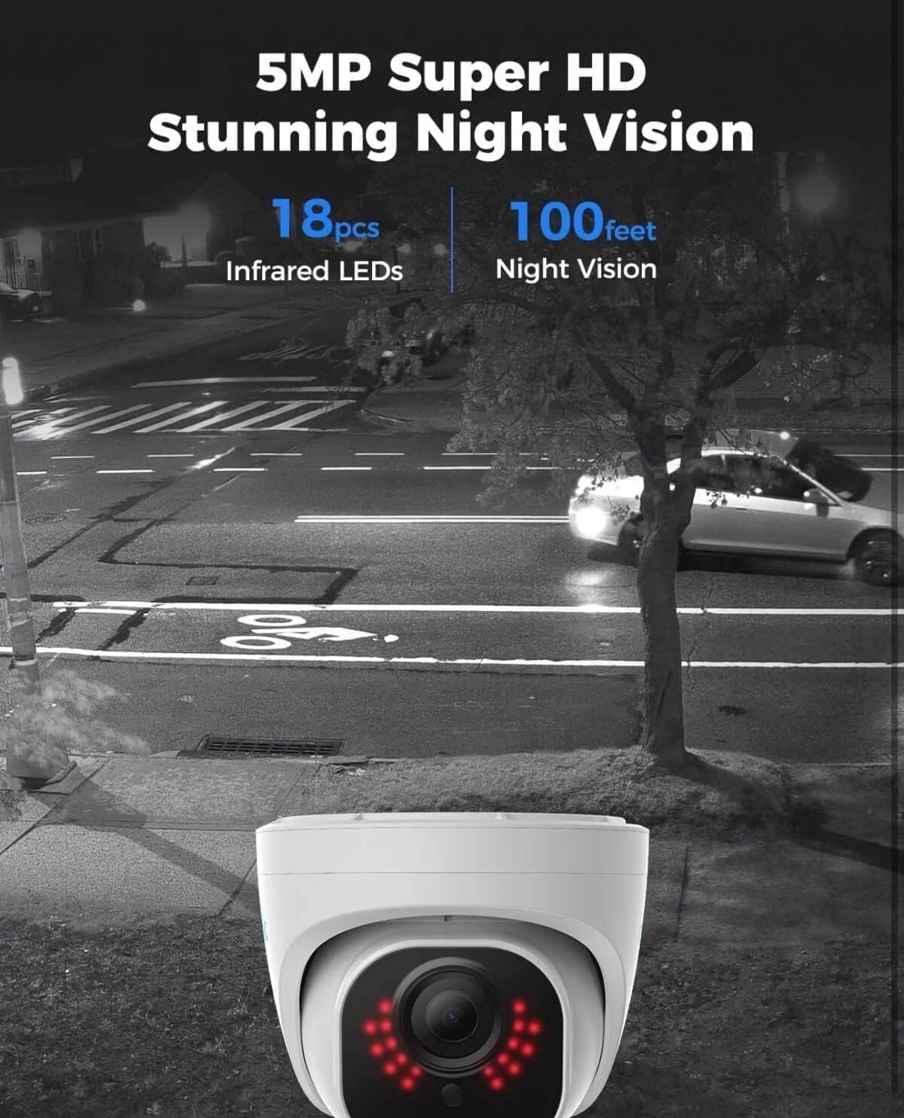 5 Megapixels & 100ft Night Vision - 2560x1920 super HD detailed image and up to 100ft night vision video monitoring, 3,000,000 more pixels than 1080P, 300% more detailed than 720P. With 8 PoE ports on the NVR video recorder, the security system is expandable to work with maximum 8 picecs of Reolink POE.