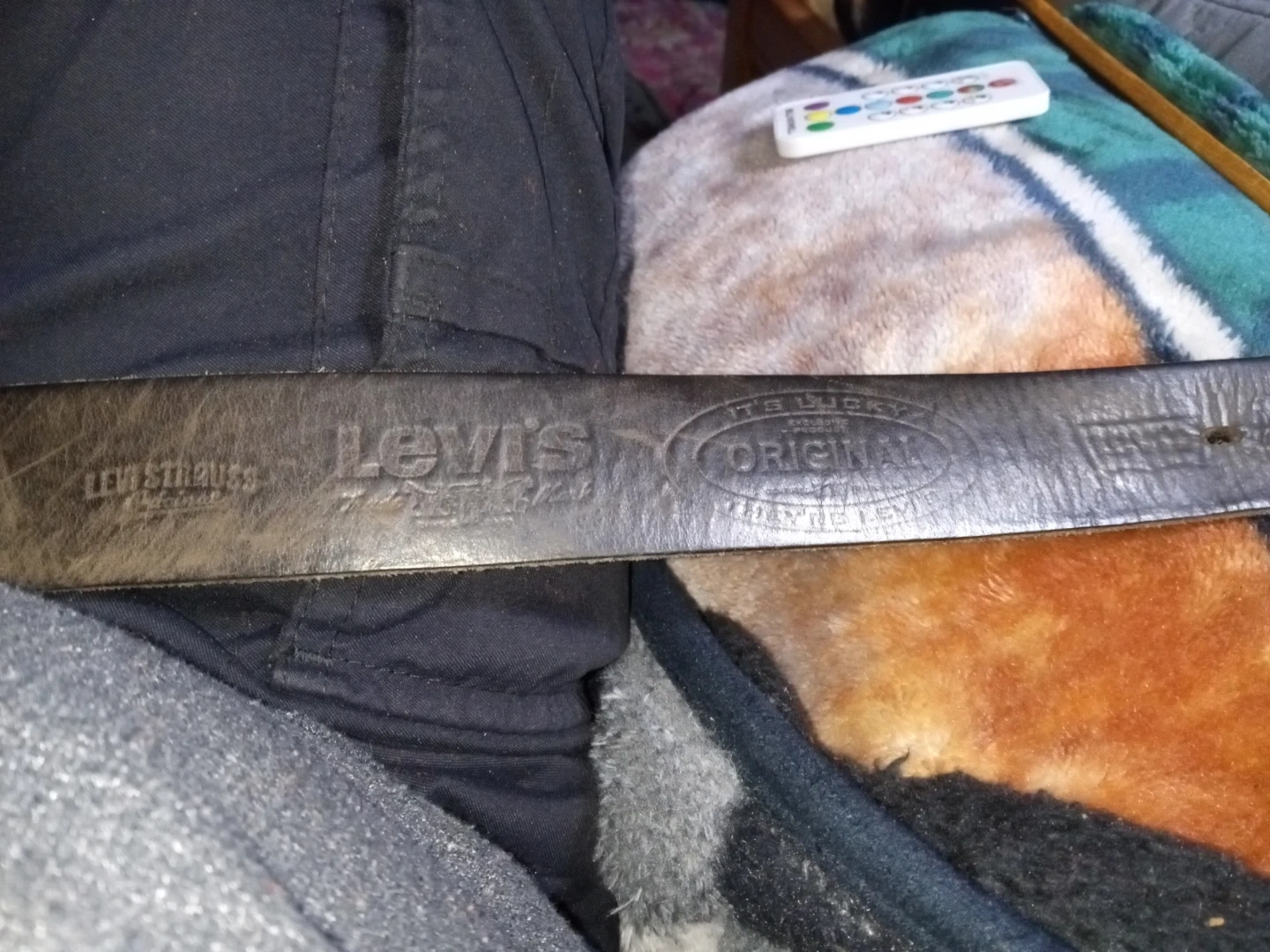 This is a Levi's leather belt with a buckle. It's embossed with 'Levi's Original' and measures approximately 42 inches in length. Made of soft genuine leather.